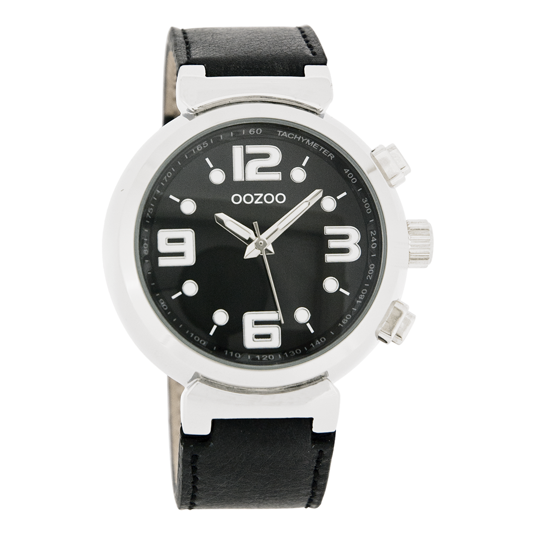 Silver coloured OOZOO watch with black leather strap - C4254