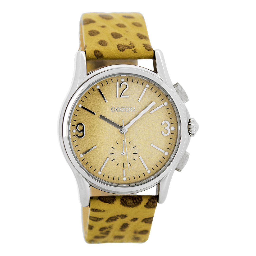 Stand out with this beautiful round ladies design from the trendy OOZOO Timepieces collection. The C7225 has a leopard print camel leather strap and 38 mm silver coloured metal watch case. You are making quite the fashion statement with this camel chrono dial, silver coloured stripes and numbers digits and matching hands. This essential watch for your wardrobe has a mineral glass, stainless steel backplate and is nickel safe. This watch has a 2 Japanese movement and is covered by a 2 year warranty (see section 3 of our Refund, shipping & warranty policy).