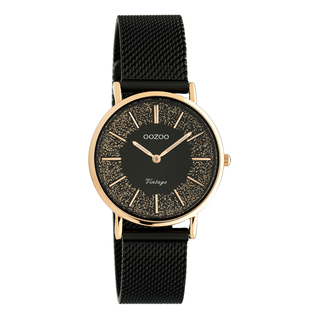 The classic look stays key in this trendy series and therefore, this round OOZOO vintage design with a playful wink is the season must-have! This ladies watch is the perfect combination of fashion and comfort with its 32 mm rose gold coloured metal watch case and black sparkling dial. The black metal mesh bracelet makes this watch a trendy accessory, which you can wear every day. The dial has rose gold coloured stripes digits and matching hands. The C20143 adds the sparkle to your outfit. The mineral glass lays in a 6,9 mm slim metal watch case with IP-plating. This design has a stainless steel backplate and is nickel safe. This watch has a 2 Japanese movement and is covered by a 2 year warranty (see section 3 of our Refund, shipping & warranty policy).