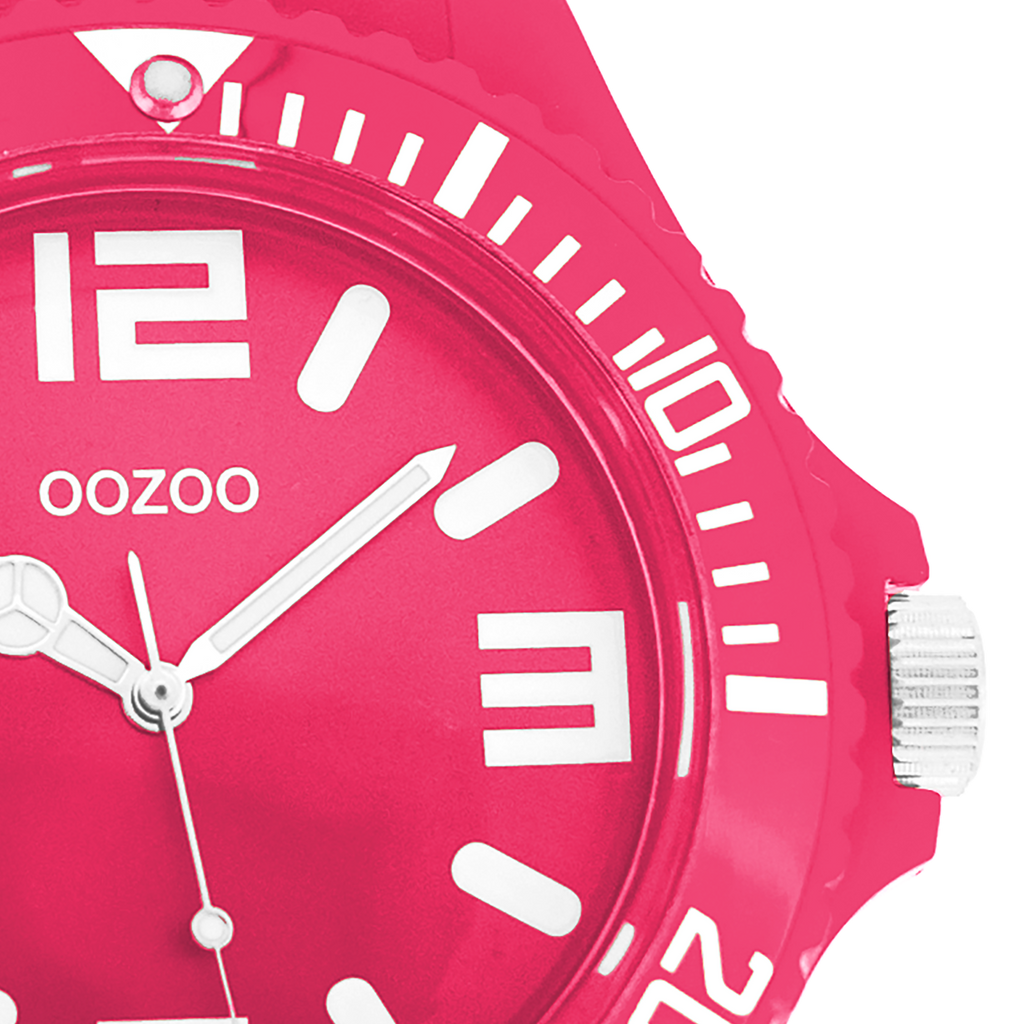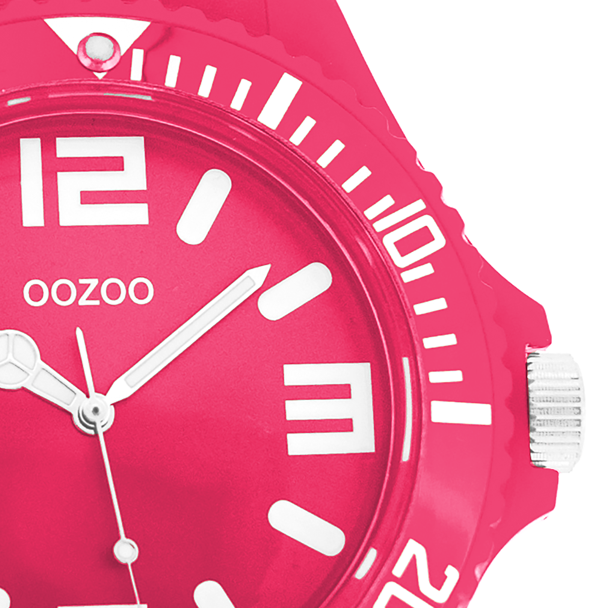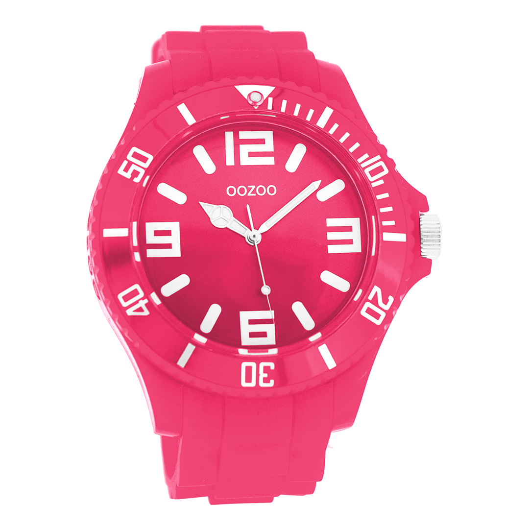 Stand out with this beautiful round unisex design from the trendy OOZOO Timepieces collection. The C4285 has a fluo pink rubber strap and 48 mm fluo pink plastic watch case. You are making quite the fashion statement with this fluo pink sunray dial, white stripes and numbers digits and silver coloured/white hands. This essential watch for your wardrobe has a mineral glass, stainless steel backplate and is nickel safe. This watch has a 2 Japanese movement and is covered by a 2 year warranty (see section 3 of our Refund, shipping & warranty policy).