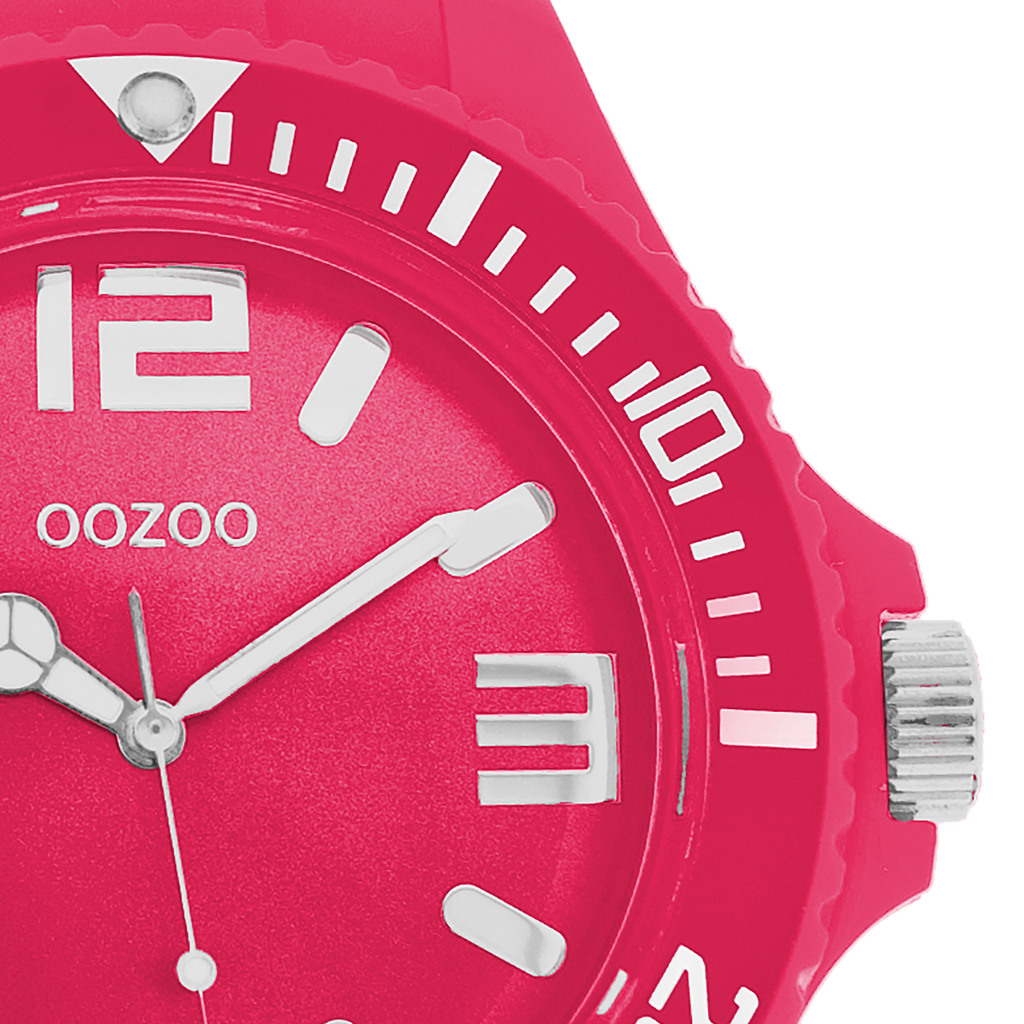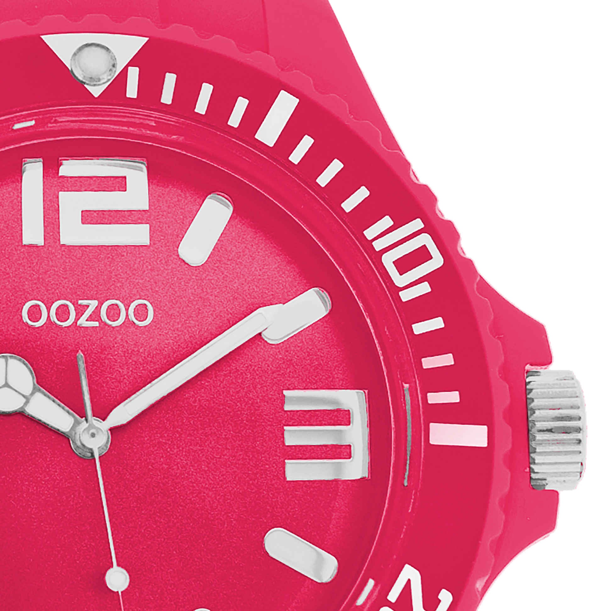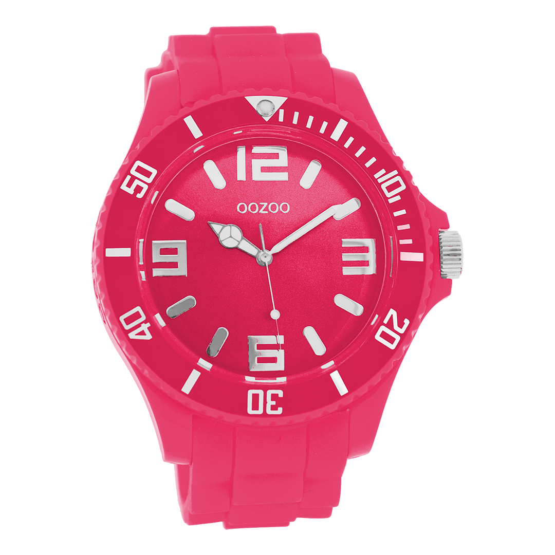Stand out with this beautiful round unisex design from the trendy OOZOO Timepieces collection. The C4334 has a fluo pink rubber strap and 48 mm fluo pink plastic watch case. You are making quite the fashion statement with this fluo pink sunray dial, silver coloured stripes and numbers digits and silver coloured/white hands. This essential watch for your wardrobe has a mineral glass, stainless steel backplate and is nickel safe. This watch has a 2 Japanese movement and is covered by a 2 year warranty (see section 3 of our Refund, shipping & warranty policy).