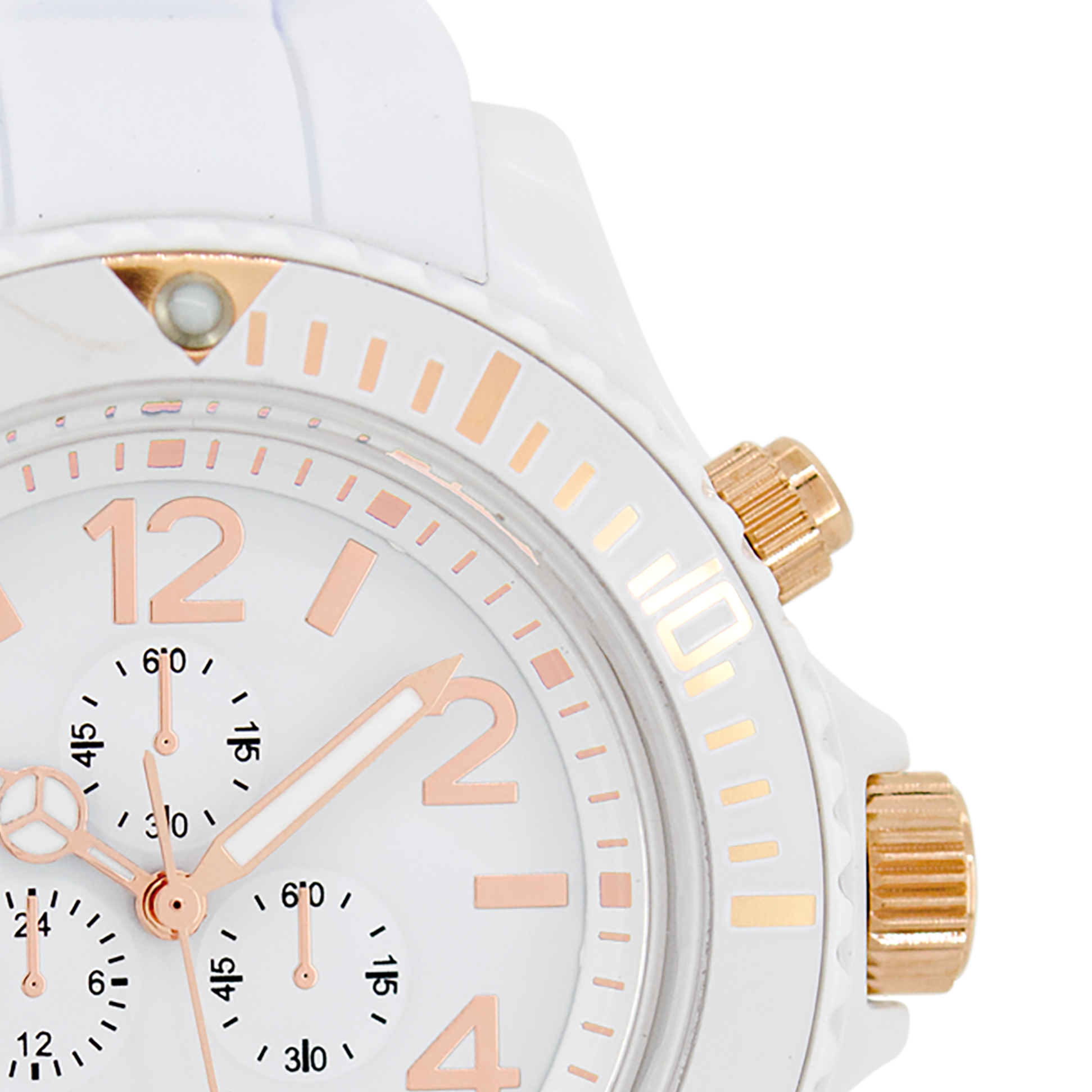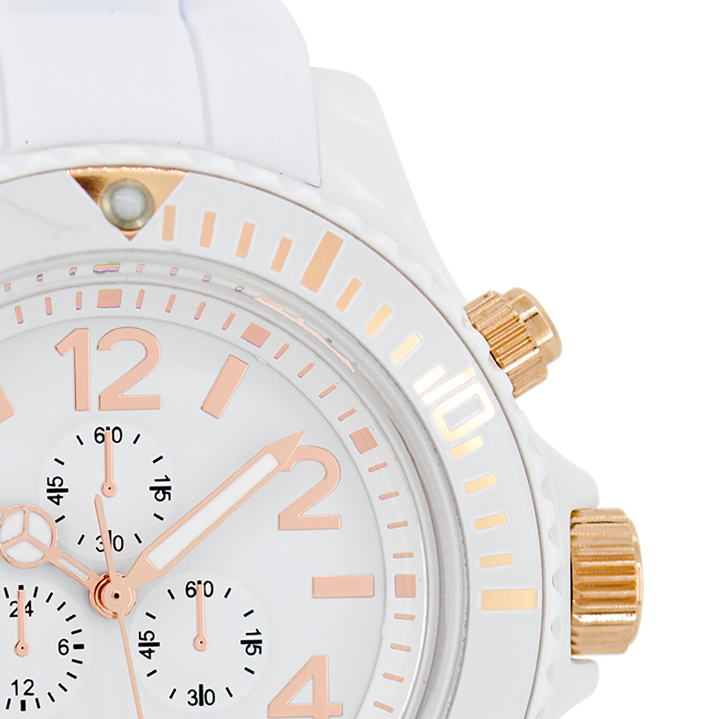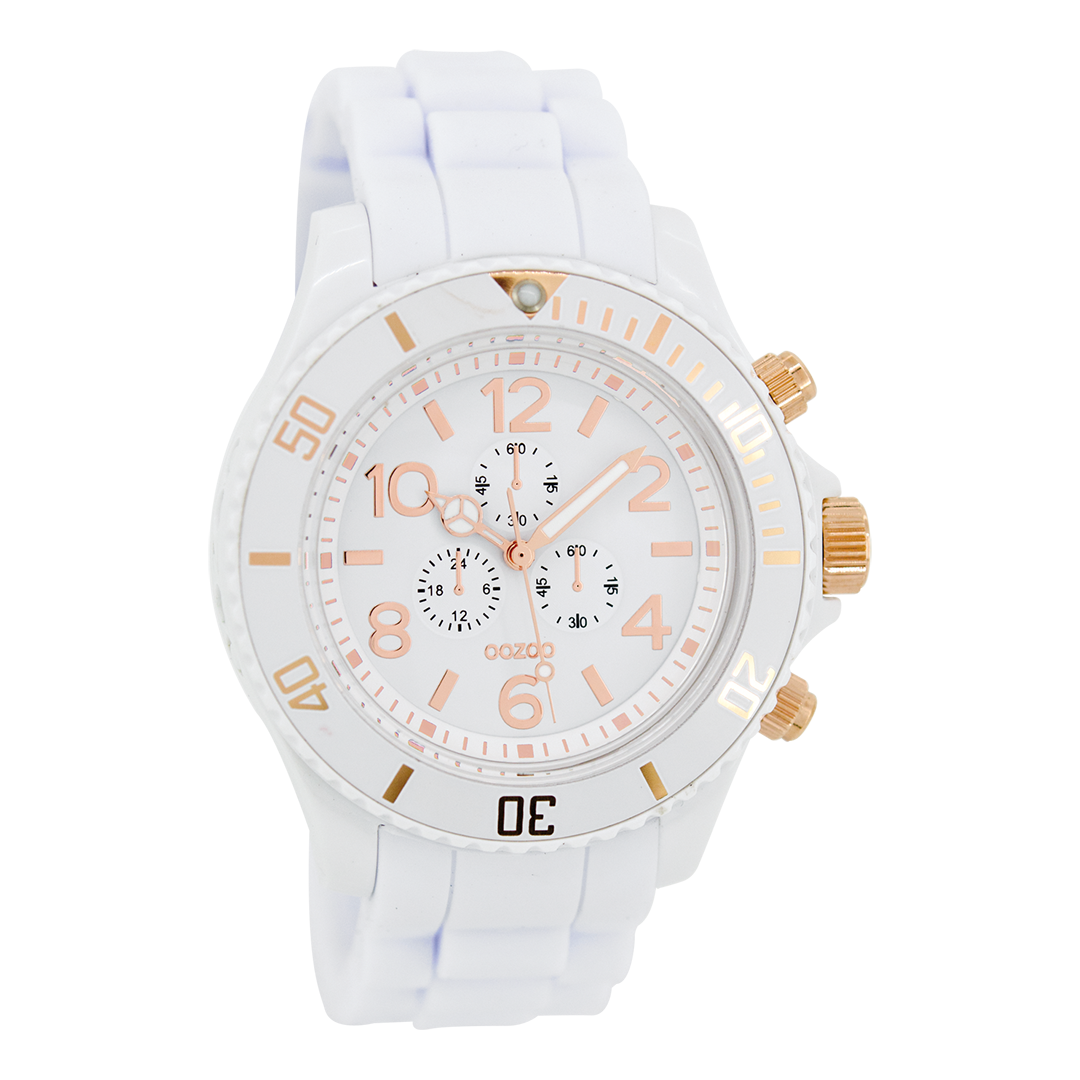 Stand out with this beautiful round unisex design from the trendy OOZOO Timepieces collection. The C4831 has a white rubber strap and 43 mm white plastic watch case. You are making quite the fashion statement with this white dial, rose gold coloured stripes and numbers digits and rose gold coloured/white hands. This essential watch for your wardrobe has a mineral glass, stainless steel backplate and is nickel safe. This watch has a 2 Japanese movement and is covered by a 2 year warranty (see section 3 of our Refund, shipping & warranty policy).