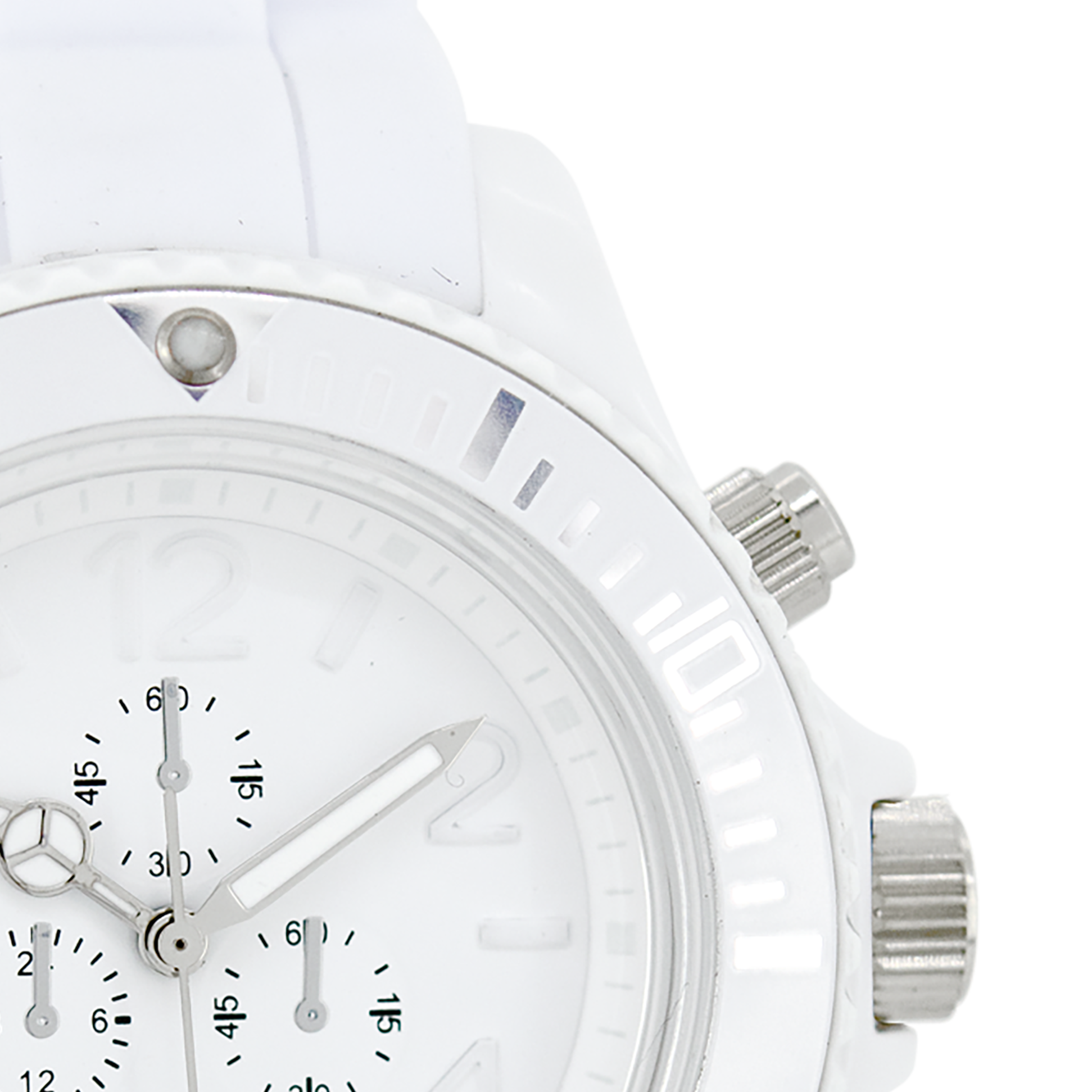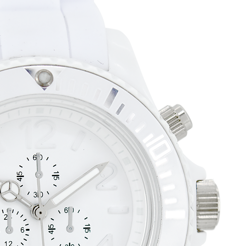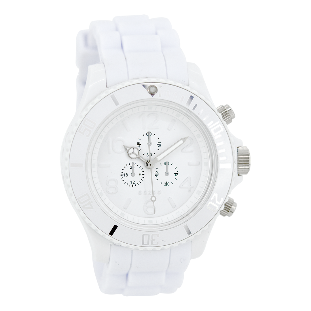 Stand out with this beautiful round unisex design from the trendy OOZOO Timepieces collection. The C4832 has a white rubber strap and 43 mm white plastic watch case. You are making quite the fashion statement with this white dial, white stripes and numbers digits and silver coloured/white hands. This essential watch for your wardrobe has a mineral glass, stainless steel backplate and is nickel safe. This watch has a 2 Japanese movement and is covered by a 2 year warranty (see section 3 of our Refund, shipping & warranty policy).