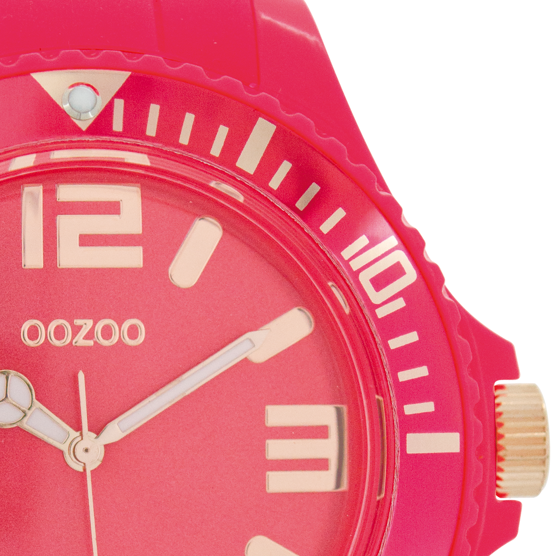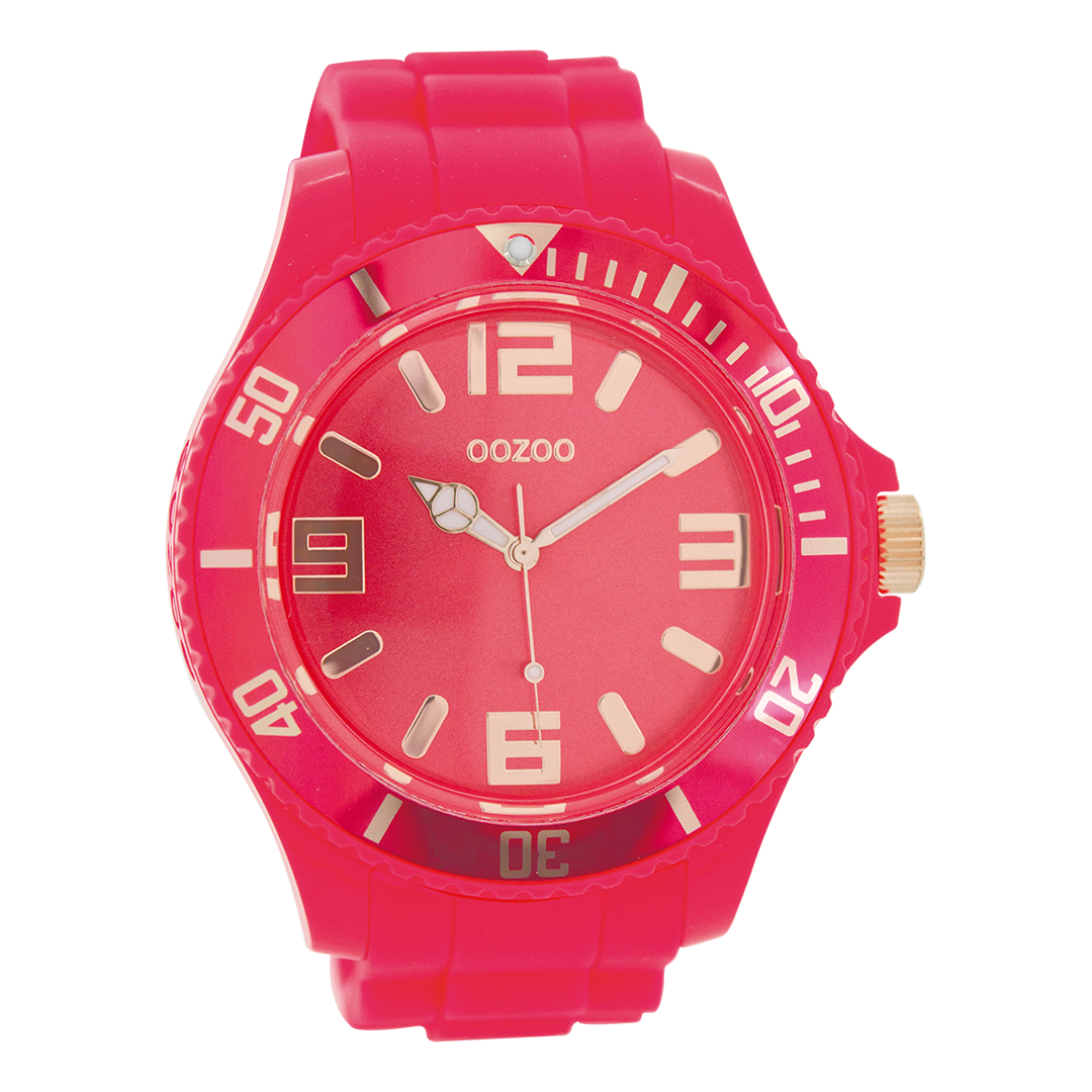 Stand out with this beautiful round unisex design from the trendy OOZOO Timepieces collection. The C5035 has a fluo pink rubber strap and 48 mm fluo pink plastic watch case. You are making quite the fashion statement with this fluo pink sunray dial, rose gold coloured stripes and numbers digits and rose gold coloured/white hands. This essential watch for your wardrobe has a mineral glass, stainless steel backplate and is nickel safe. This watch has a 2 Japanese movement and is covered by a 2 year warranty (see section 3 of our Refund, shipping & warranty policy).
