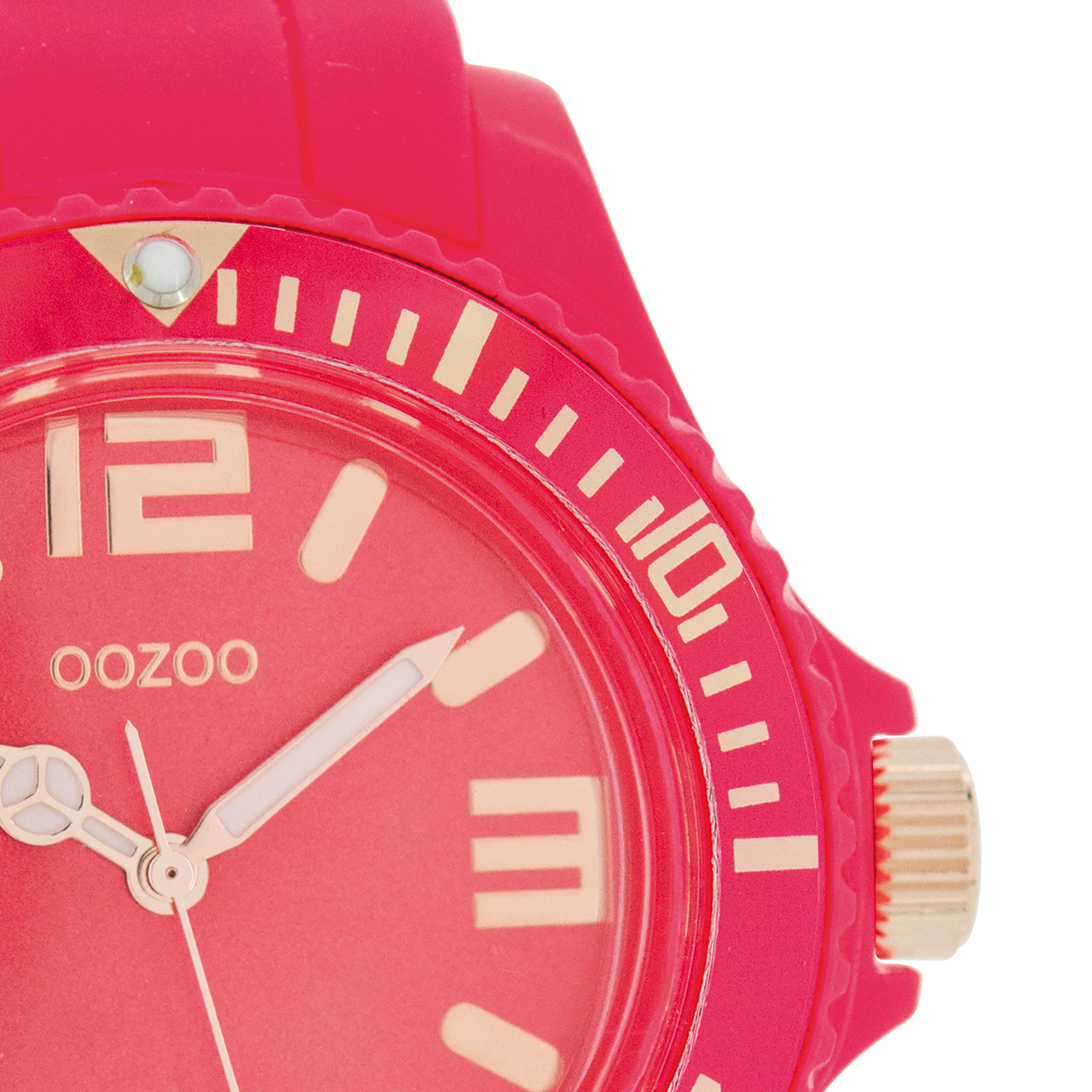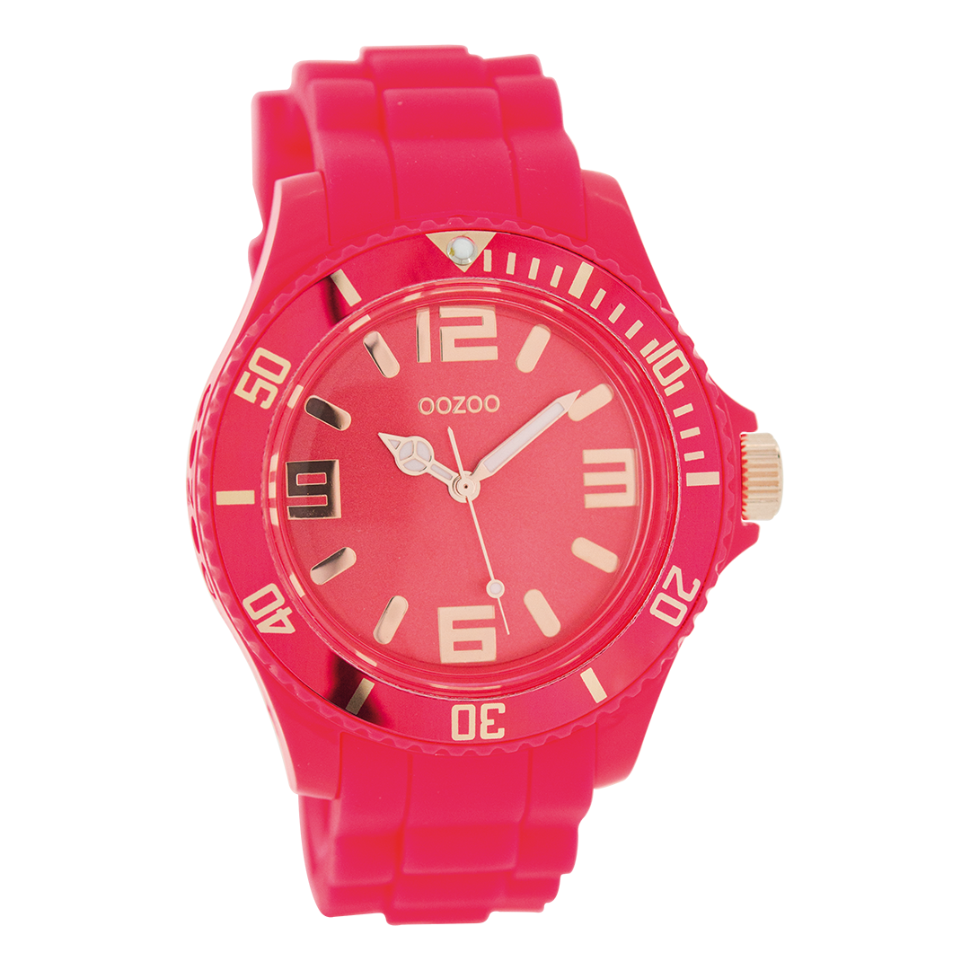 Stand out with this beautiful round unisex design from the trendy OOZOO Timepieces collection. The C5055 has a fluo pink rubber strap and 43 mm fluo pink plastic watch case. You are making quite the fashion statement with this fluo pink sunray dial, rose gold coloured stripes and numbers digits and rose gold coloured/white hands. This essential watch for your wardrobe has a mineral glass, stainless steel backplate and is nickel safe. This watch has a 2 Japanese movement and is covered by a 2 year warranty (see section 3 of our Refund, shipping & warranty policy).
