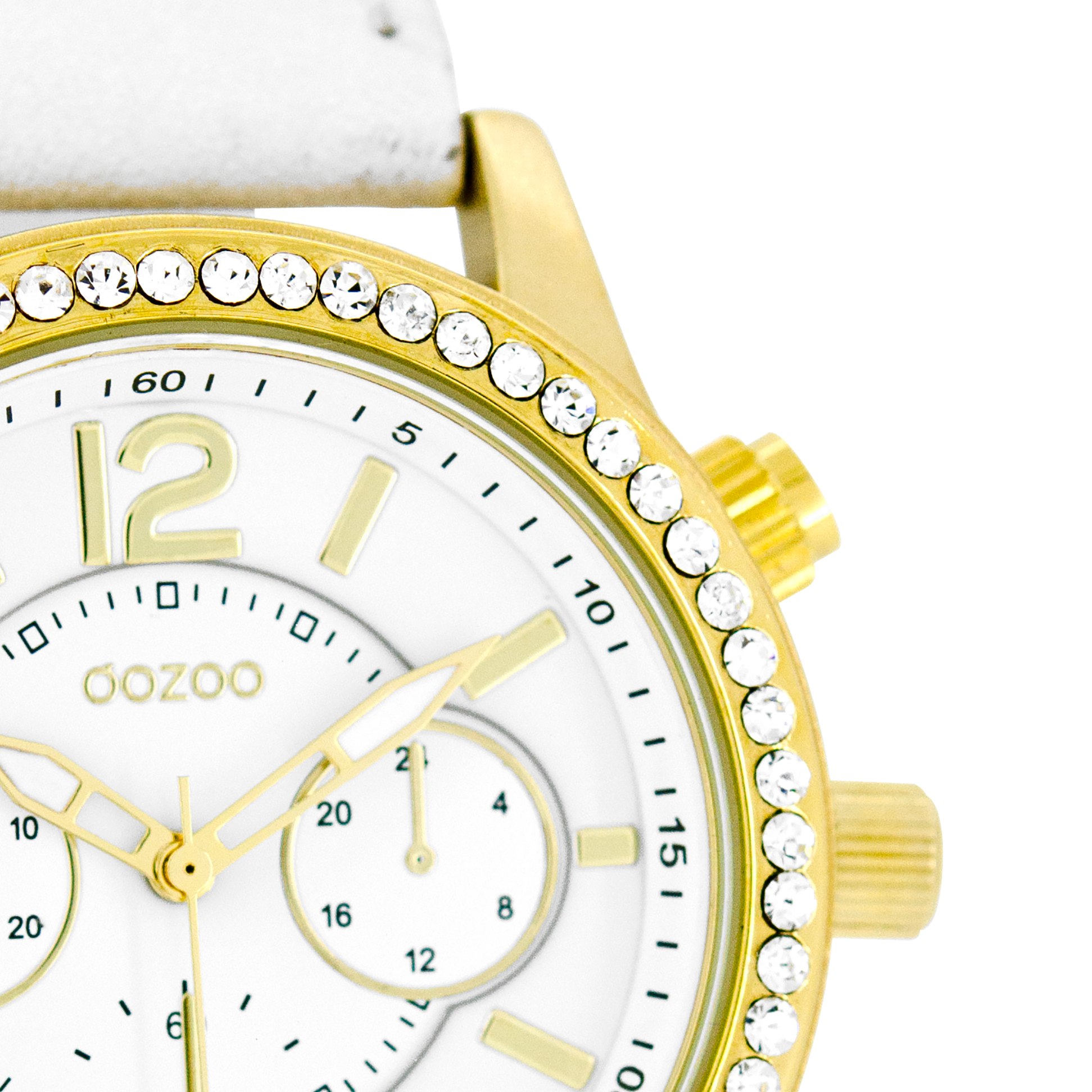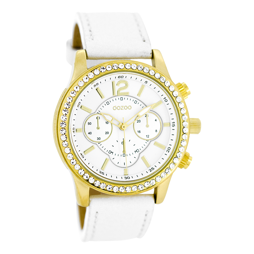 Stand out with this beautiful round ladies design from the trendy OOZOO Timepieces collection. The C5645 has a stitched white leather strap and 40 mm gold coloured metal watch case. You are making quite the fashion statement with this white chrono dial, gold coloured stripes and numbers digits and gold coloured/white hands. This essential watch for your wardrobe has a mineral glass, stainless steel backplate and is nickel safe. This watch has a 2 Japanese movement and is covered by a 2 year warranty (see section 3 of our Refund, shipping & warranty policy).