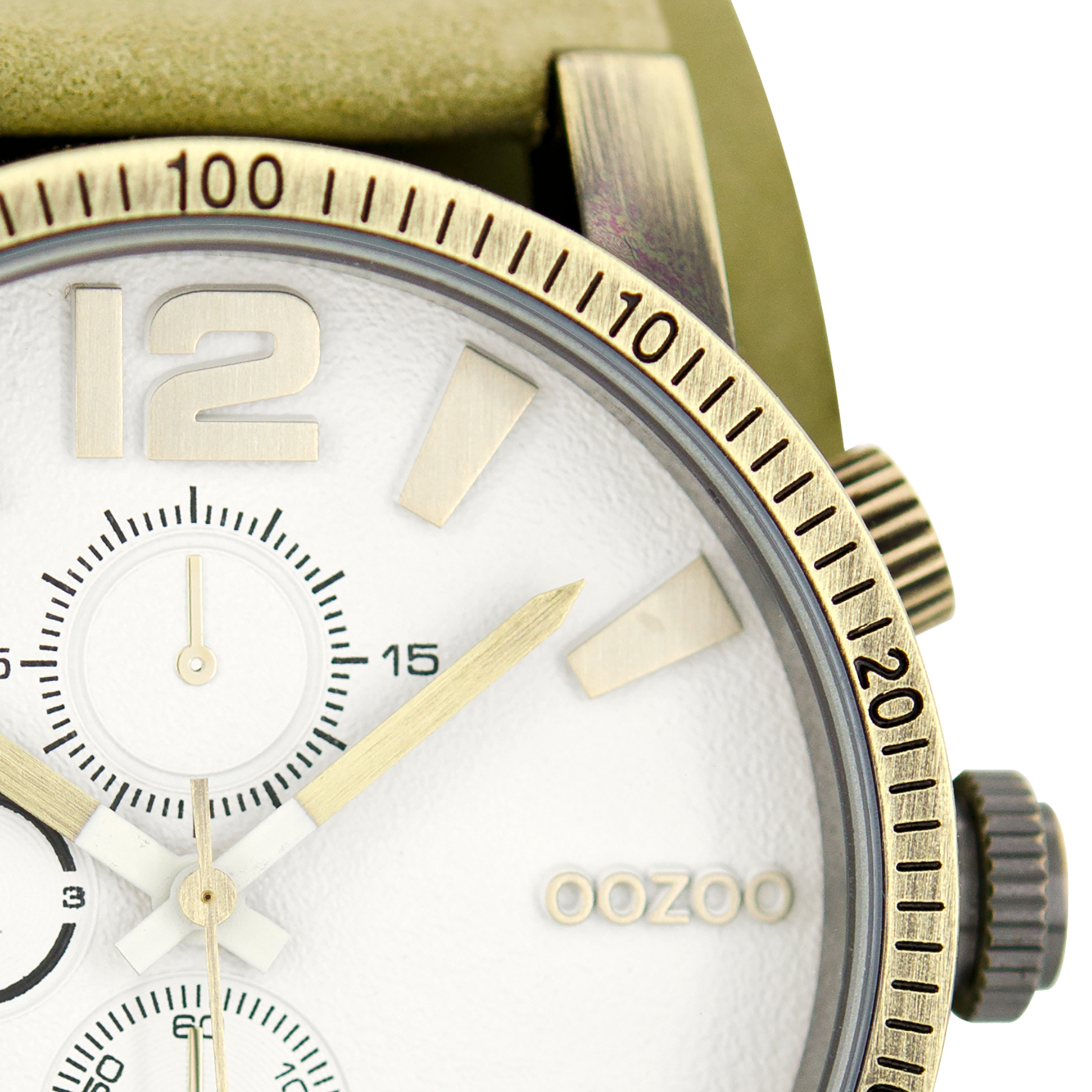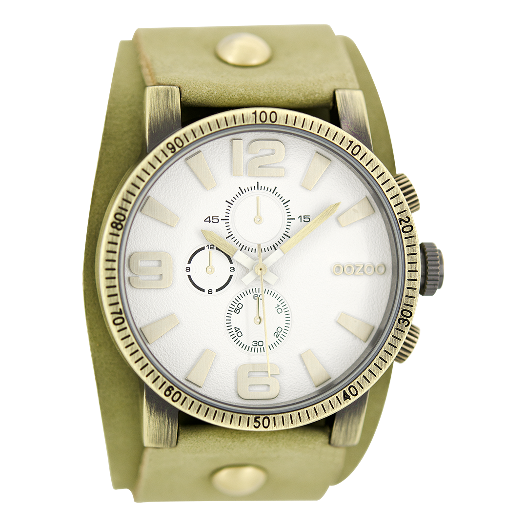 Stand out with this beautiful round gents design from the trendy OOZOO Timepieces collection. The C6475 has a studded sand leather strap and 45 mm gold coloured brushed metal watch case. You are making quite the fashion statement with this white chrono dial, gold coloured stripes and numbers digits and matching hands. This essential watch for your wardrobe has a mineral glass, stainless steel backplate and is nickel safe. This watch has a 2 Japanese movement and is covered by a 2 year warranty (see section 3 of our Refund, shipping & warranty policy).