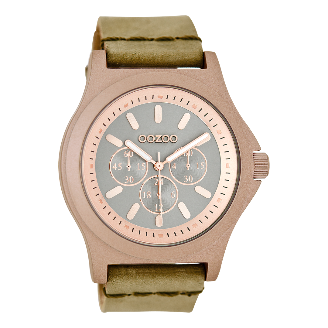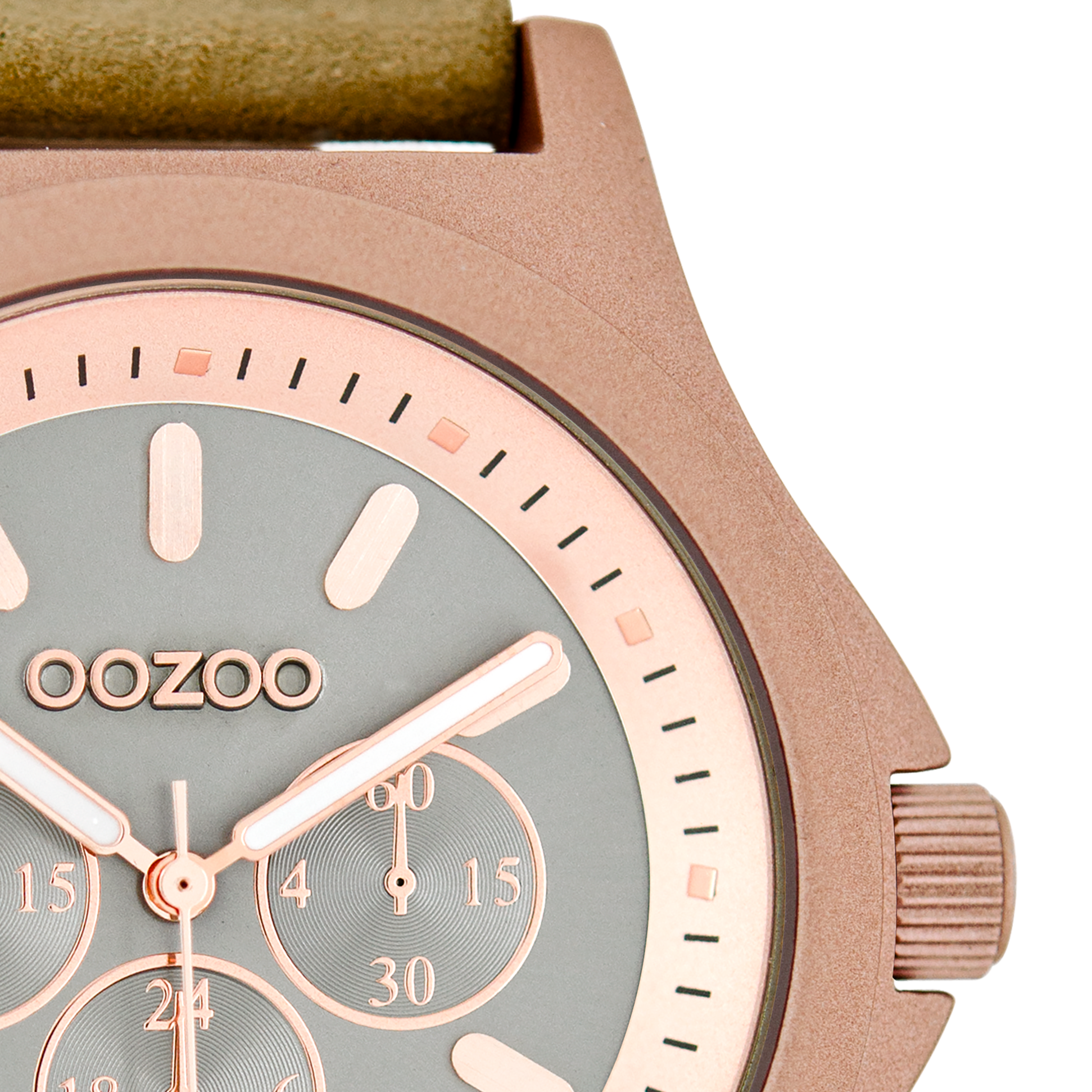 Stand out with this beautiful round ladies design from the trendy OOZOO Timepieces collection. The C6511 has a stitched camel leather strap and 43 mm rose gold coloured matte watch case. You are making quite the fashion statement with this grey chrono dial, rose gold coloured stripes digits and rose gold coloured/white hands. This essential watch for your wardrobe has a mineral glass, stainless steel backplate and is nickel safe. This watch has a 2 Japanese movement and is covered by a 2 year warranty (see section 3 of our Refund, shipping & warranty policy).