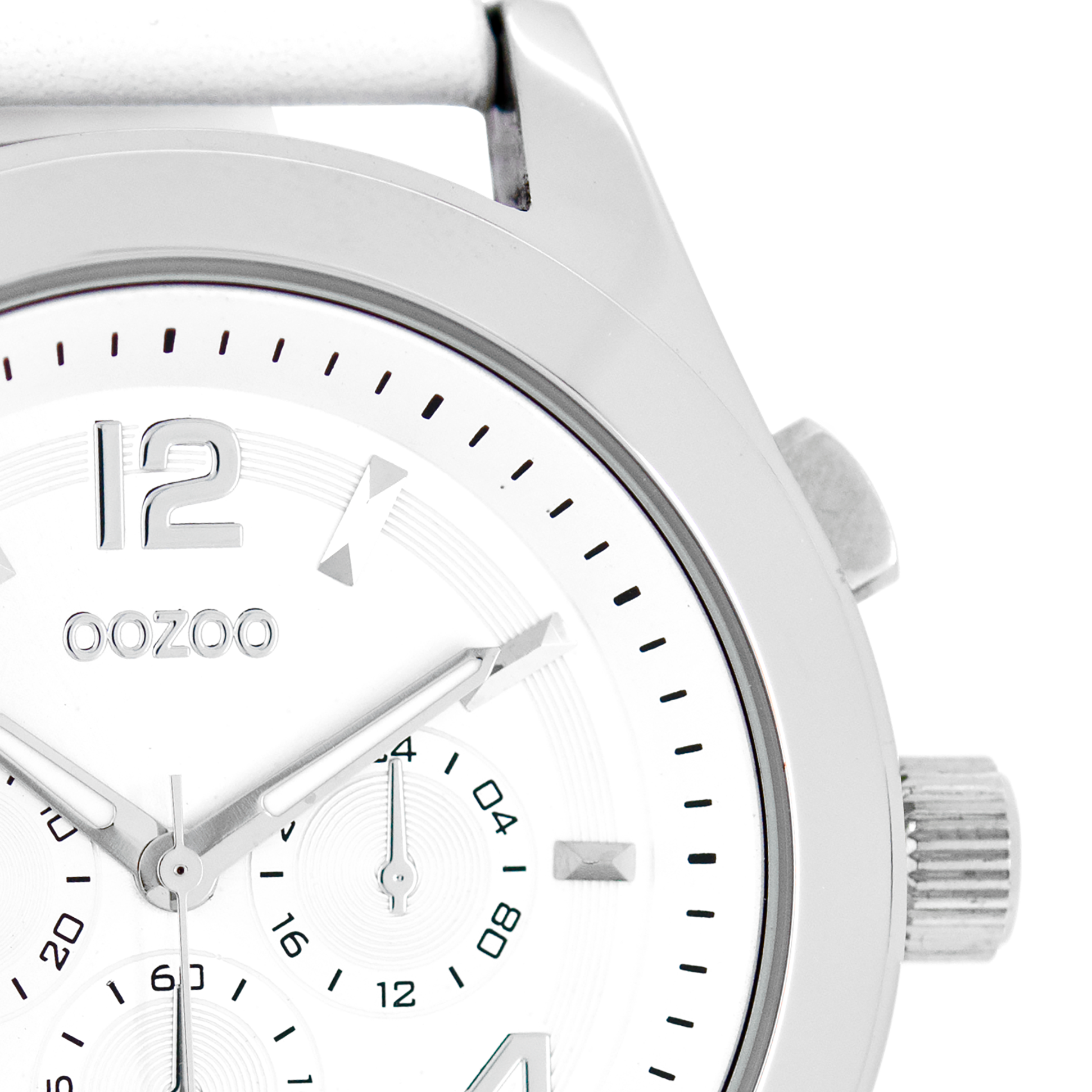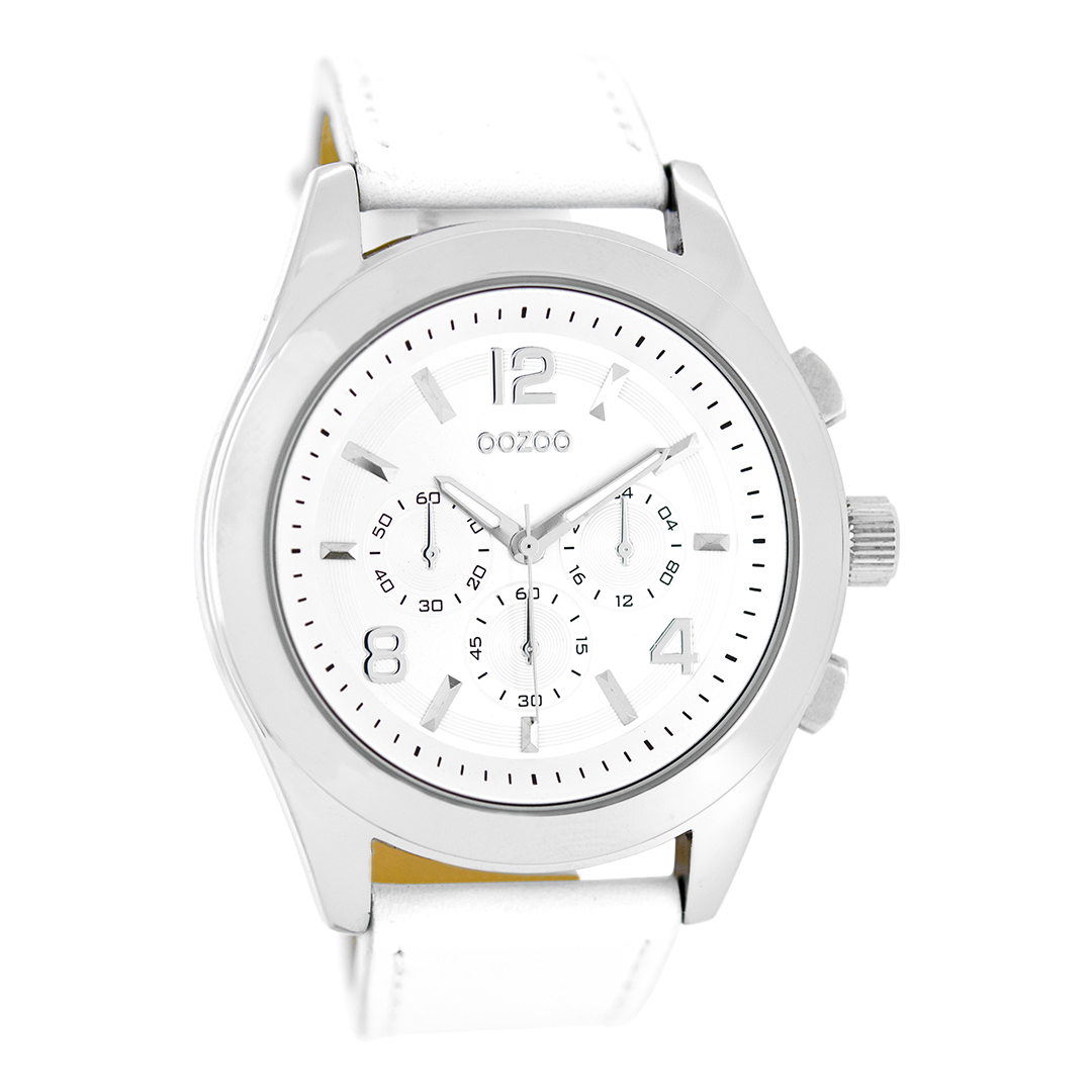 Stand out with this beautiful round ladies design from the trendy OOZOO Timepieces collection. The C6585 has a stitched white leather strap and 45 mm silver coloured metal watch case. You are making quite the fashion statement with this white chrono dial, silver coloured stripes and numbers digits and silver coloured/white hands. This essential watch for your wardrobe has a mineral glass, stainless steel backplate and is nickel safe. This watch has a 2 Japanese movement and is covered by a 2 year warranty (see section 3 of our Refund, shipping & warranty policy).