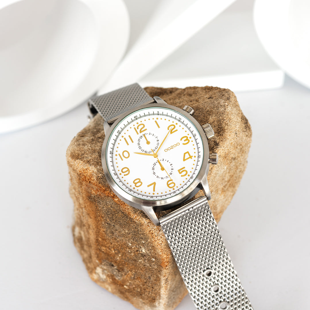 Stand out with this beautiful round gents design from the trendy OOZOO Timepieces collection. The C7087 has a silver coloured metal mesh bracelet and 50 mm silver coloured metal watch case. You are making quite the fashion statement with this white chrono dial, gold coloured dots and numbers digits and matching hands. This essential watch for your wardrobe has a mineral glass, stainless steel backplate and is nickel safe. This watch has a 2 Japanese movement and is covered by a 2 year warranty (see section 3 of our Refund, shipping & warranty policy).