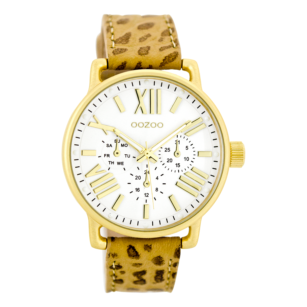 Stand out with this beautiful round ladies design from the trendy OOZOO Timepieces collection. The C7186 has a leopard print camel leather strap and 40 mm gold coloured matte watch case. You are making quite the fashion statement with this white chrono dial, gold coloured Roman numerals digits and gold coloured/white hands. This essential watch for your wardrobe has a mineral glass, stainless steel backplate and is nickel safe. This watch has a 2 Japanese movement and is covered by a 2 year warranty (see section 3 of our Refund, shipping & warranty policy).