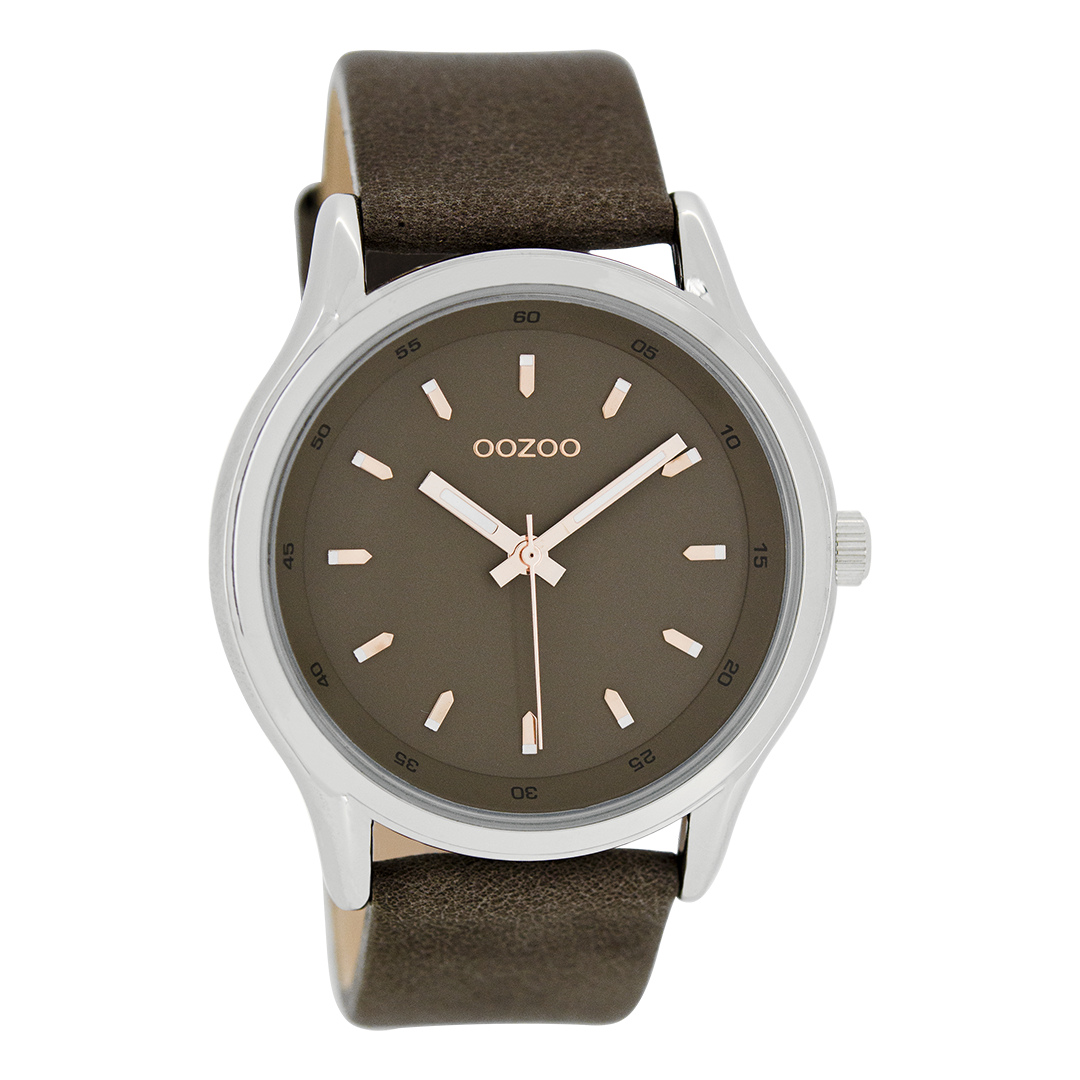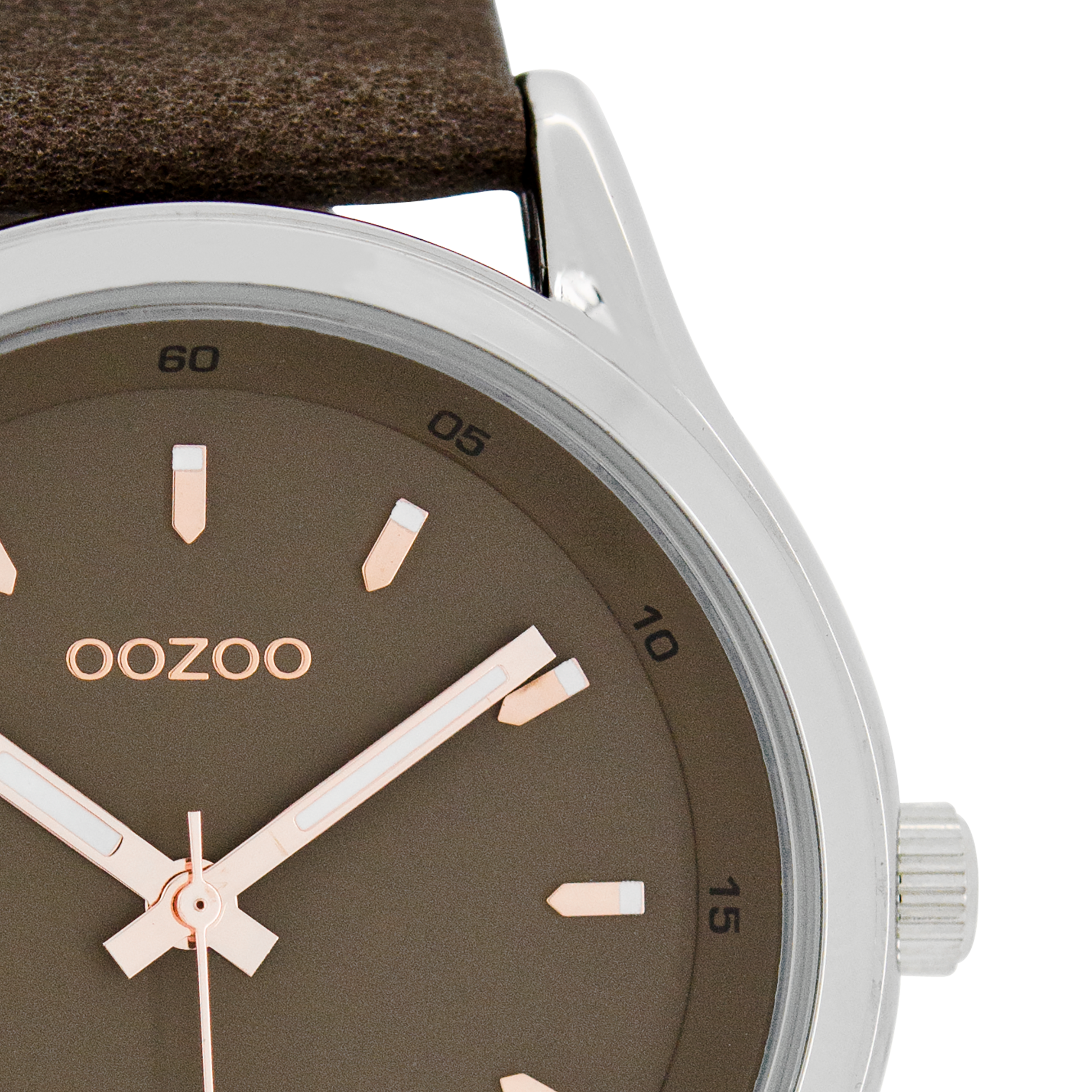 Silver coloured OOZOO watch with dark brown leather strap - C7439