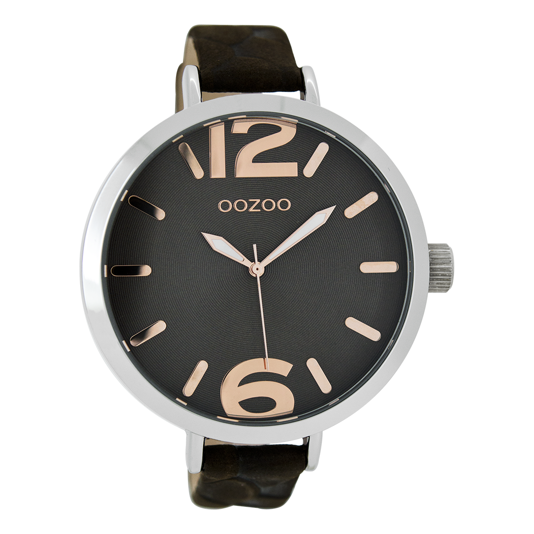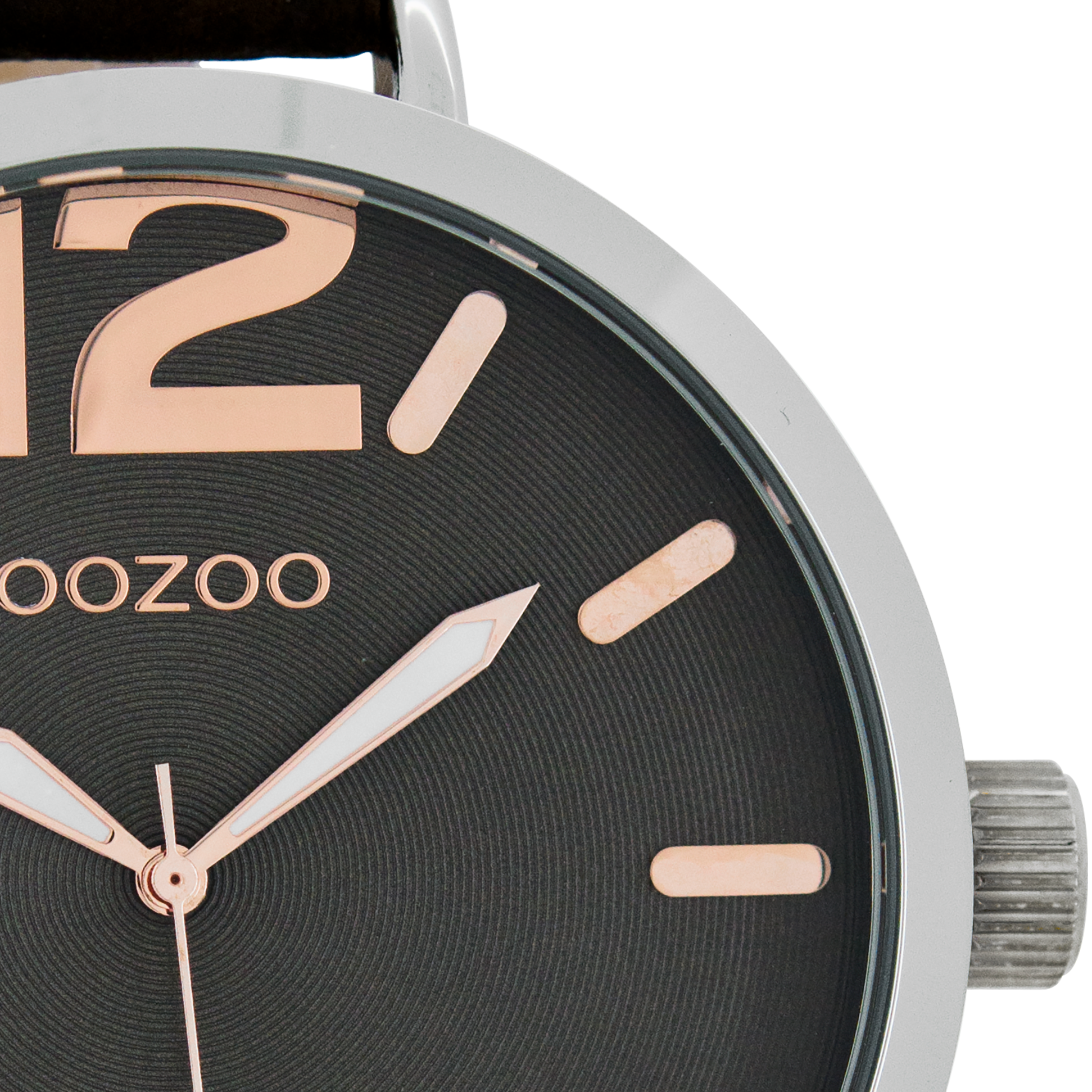 Silver coloured OOZOO watch with dark brown leather strap - C7513