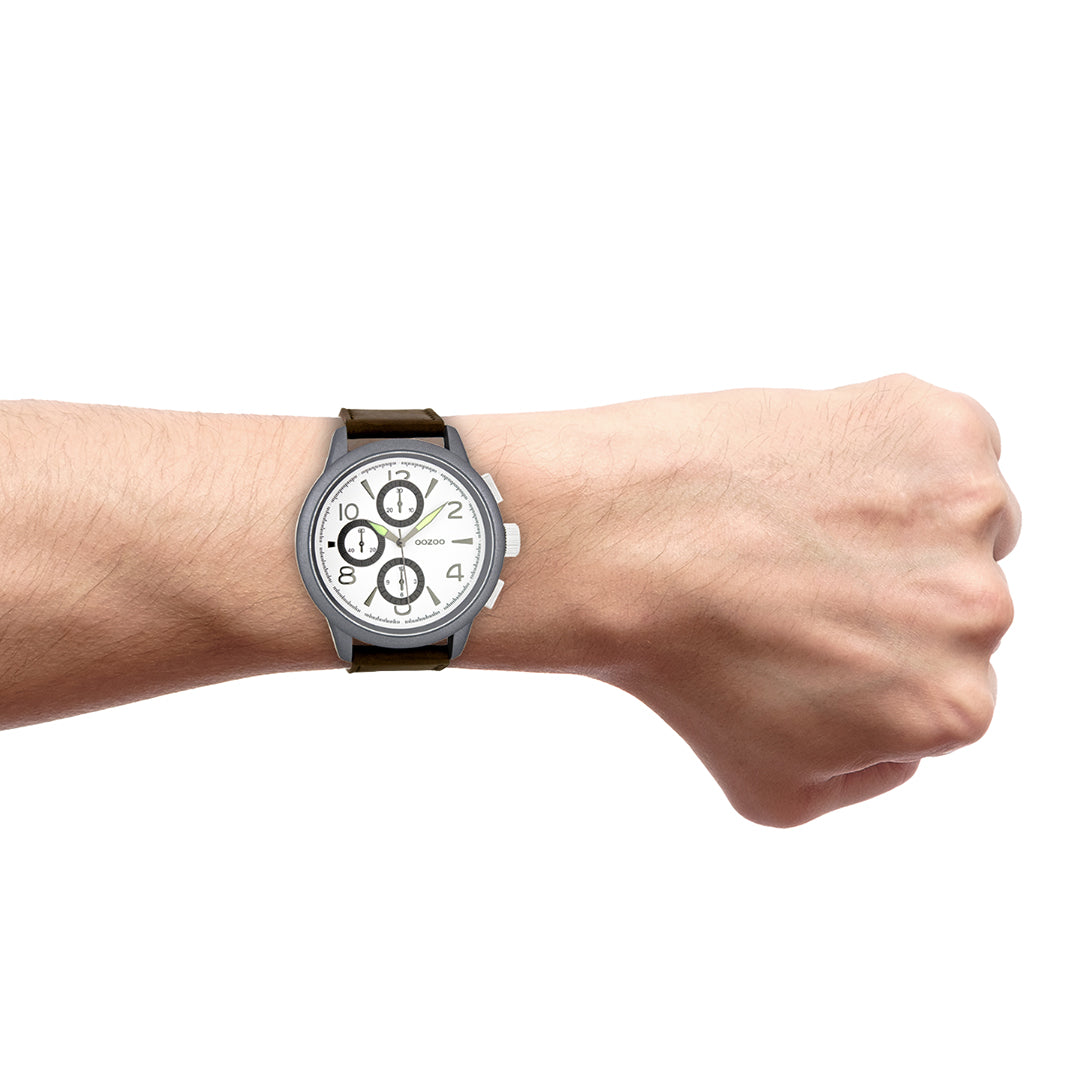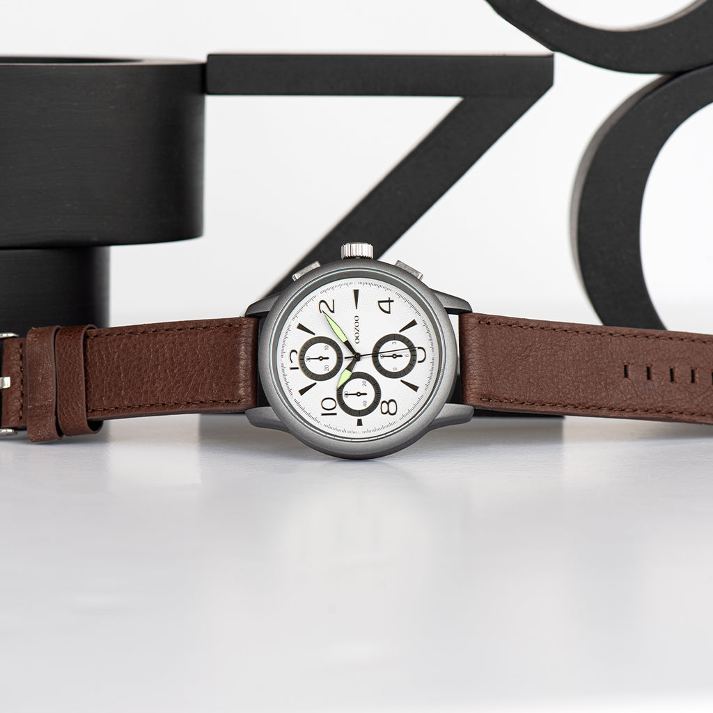 Stand out with this beautiful round gents design from the trendy OOZOO Timepieces collection. The C7875 has a stitched dark brown leather strap and 50 mm titanium matte watch case. You are making quite the fashion statement with this white chrono dial, titanium stripes and numbers digits and glow in the dark hands. This essential watch for your wardrobe has a mineral glass, stainless steel backplate and is nickel safe. This watch has a 2 Japanese movement and is covered by a 2 year warranty (see section 3 of our Refund, shipping & warranty policy).