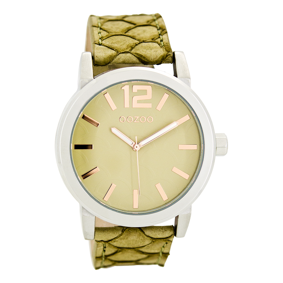 Stand out with this beautiful round ladies design from the trendy OOZOO Timepieces collection. The C7995 has a snake sand/light green leather strap and 43 mm silver coloured metal watch case. You are making quite the fashion statement with this sand dial, rose gold coloured stripes and numbers digits and rose gold coloured/white hands. This essential watch for your wardrobe has a mineral glass, stainless steel backplate and is nickel safe. This watch has a 2 Japanese movement and is covered by a 2 year warranty (see section 3 of our Refund, shipping & warranty policy).