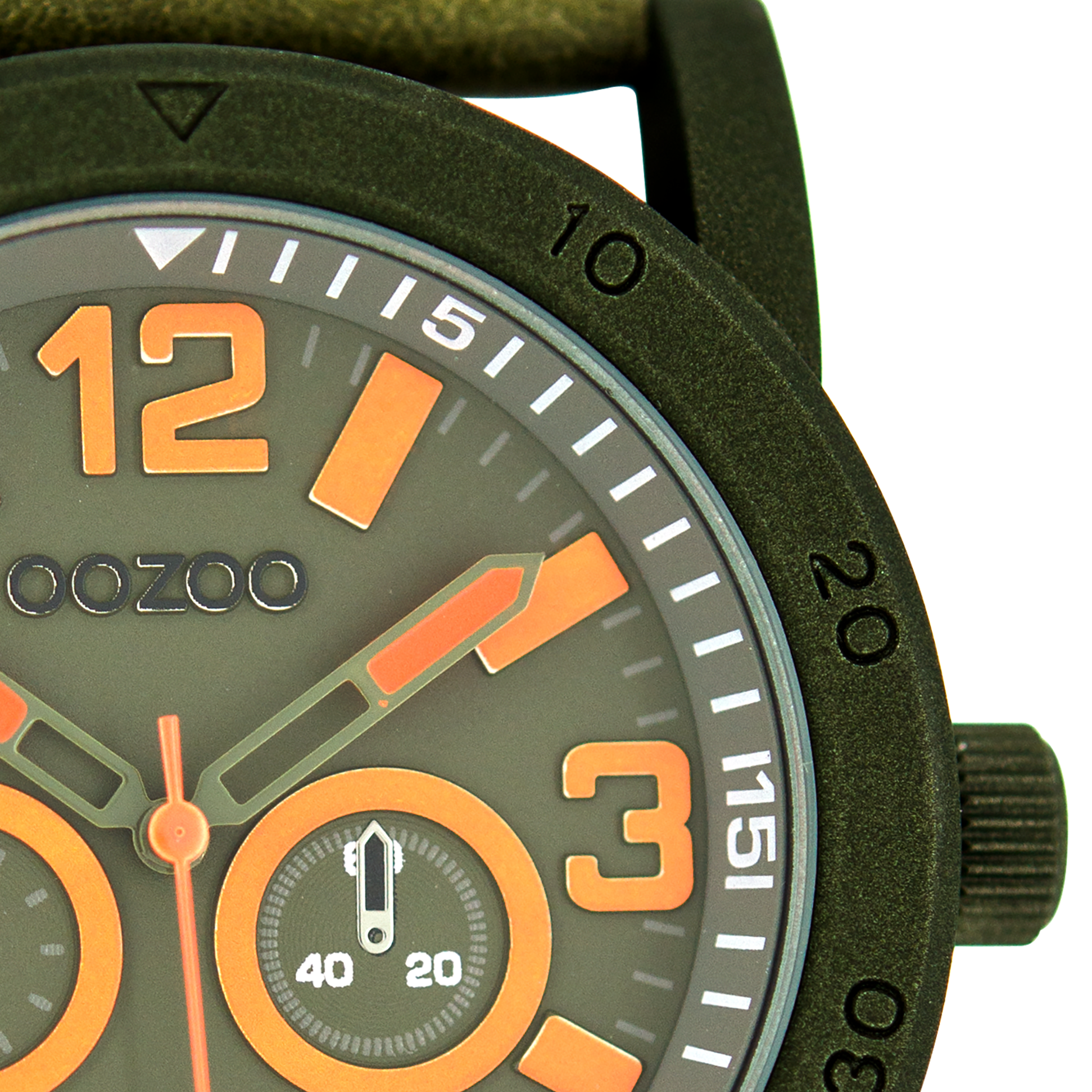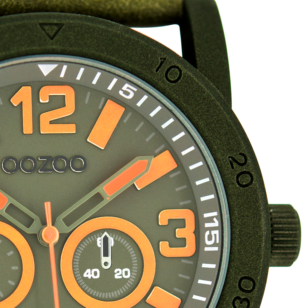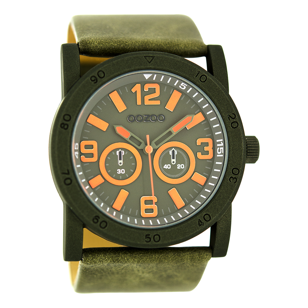 Stand out with this beautiful round gents design from the trendy OOZOO Timepieces collection. The C8307 has a dark green leather strap and 47 mm black matte watch case. You are making quite the fashion statement with this dark green chrono dial, orange stripes and numbers digits and matching hands. This essential watch for your wardrobe has a mineral glass, stainless steel backplate and is nickel safe. This watch has a 2 Japanese movement and is covered by a 2 year warranty (see section 3 of our Refund, shipping & warranty policy).