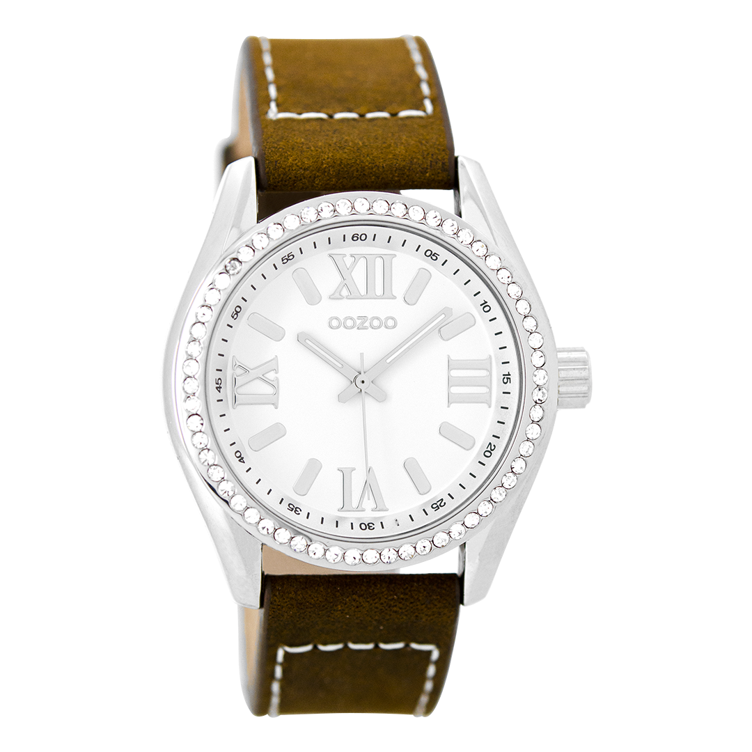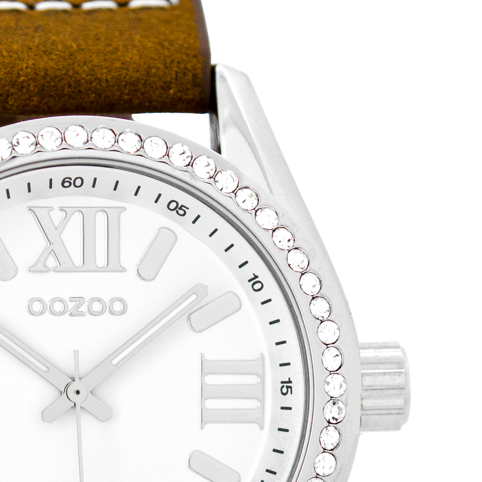 Silver coloured OOZOO watch with cognac leather strap - C8739