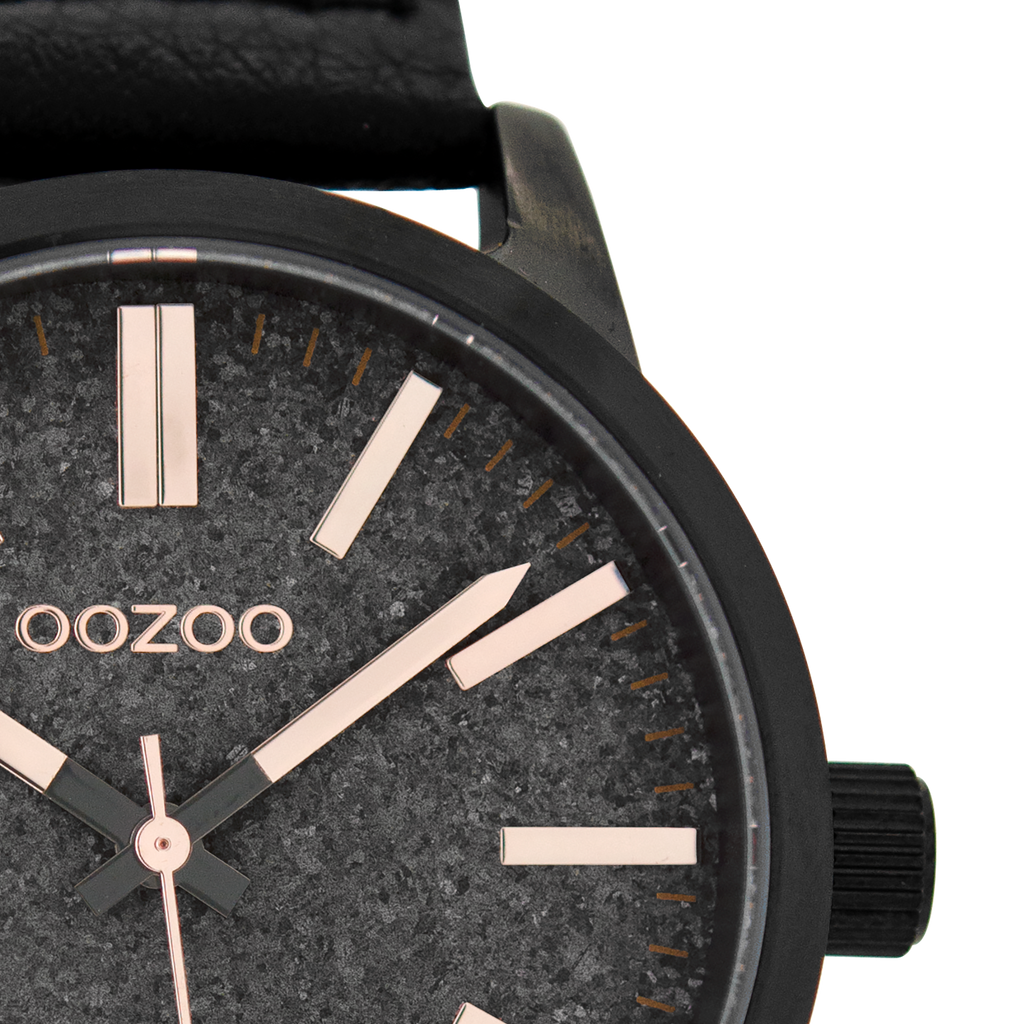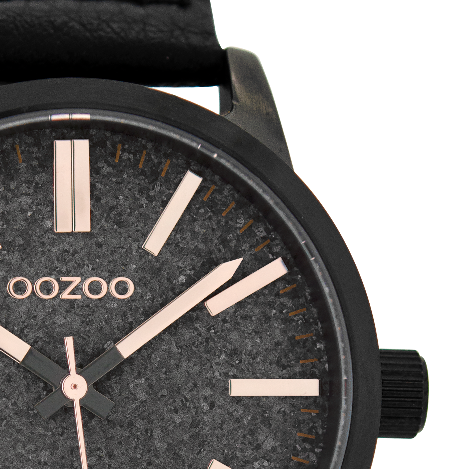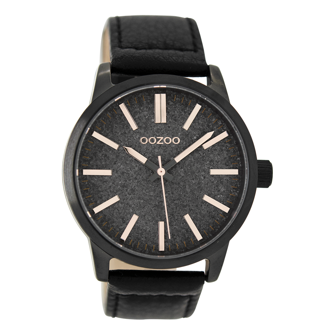Stand out with this beautiful round gents design from the trendy OOZOO Timepieces collection. The C9068 has a black leather strap and 43 mm black metal watch case. You are making quite the fashion statement with this black grit dial, rose gold coloured stripes digits and rose gold coloured/black hands. This essential watch for your wardrobe has a mineral glass, stainless steel backplate and is nickel safe. This watch has a 2 Japanese movement and is covered by a 2 year warranty (see section 3 of our Refund, shipping & warranty policy).