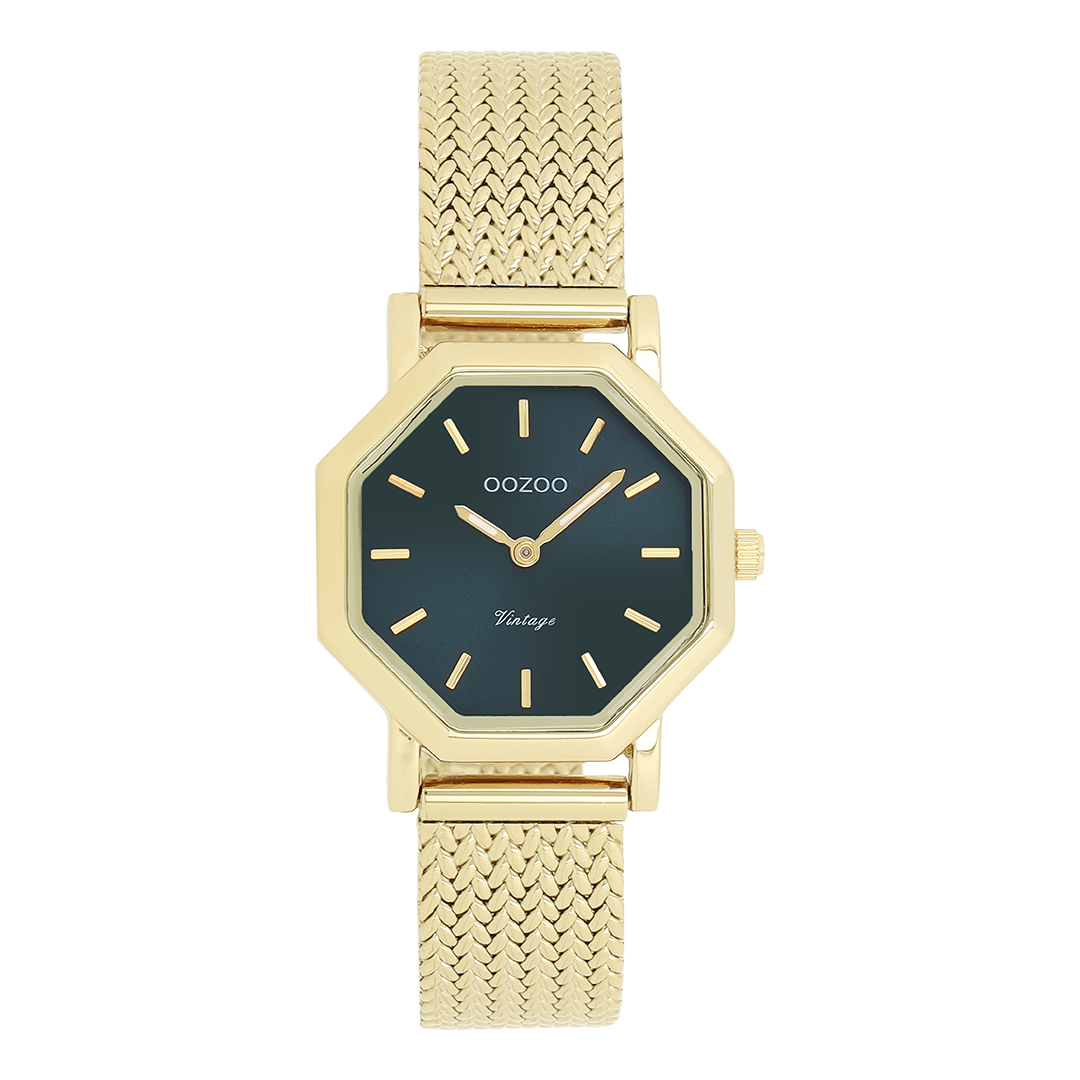 The classic look stays key in this trendy series and therefore, this octagon OOZOO vintage design with a playful wink is the season must-have! This ladies watch is the perfect combination of fashion and comfort with its 28x28 mm gold coloured metal watch case and dark green sunray dial. The gold coloured metal v-mesh bracelet makes this watch a trendy accessory, which you can wear every day. The dial has gold coloured stripes digits and matching hands. The C20438 adds the sparkle to your outfit. The mineral glass lays in a mm slim metal watch case with IP-plating. This design has a stainless steel backplate and is nickel safe. This watch has a 2ATM Japanese movement and is covered by a 2 year warranty (see section 3 of our Refund, shipping & warranty policy).