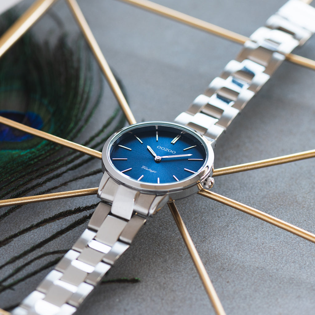 Sophistication and elegance are two elements of our beautiful OOZOO Vintage Classics. This classic round design with a contemporary twist is something for everyone. This unisex watch is the perfect combination of comfort and fashion with its 34 mm silver coloured metal watch case and blue with sunray dial. The matte/shiny silver coloured stainless steel bracelet makes this watch an all-time classic which you can wear with every occasion. The dial has silver coloured stripes digits and matching hands. The C20041 is a must have for your every-wear. The mineral glass lays in a 6,9 mm slim metal watch case with IP-plating. This design has a stainless steel backplate and is nickel safe. This watch has a 2 Japanese movement and is covered by a 2 year warranty (see section 3 of our Refund, shipping & warranty policy).