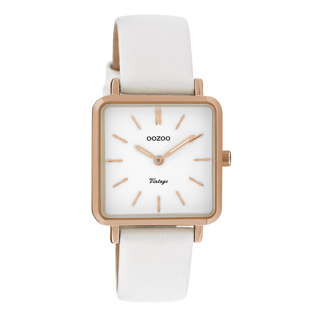 The classic look stays key in this trendy series and therefore, this square OOZOO vintage design with a playful wink is the season must-have! This ladies watch is the perfect combination of fashion and comfort with its 29 mm rose gold coloured metal watch case and white dial. The metallic look white leather strap makes this watch a trendy accessory, which you can wear every day. The dial has rose gold stripes digits and matching hands. The C9941 adds the sparkle to your outfit. The mineral glass lays in a 6,9 mm slim metal watch case with IP-plating. This design has a stainless steel backplate and is nickel safe. This watch has a 2 Japanese movement and is covered by a 2 year warranty (see section 3 of our Refund, shipping & warranty policy).