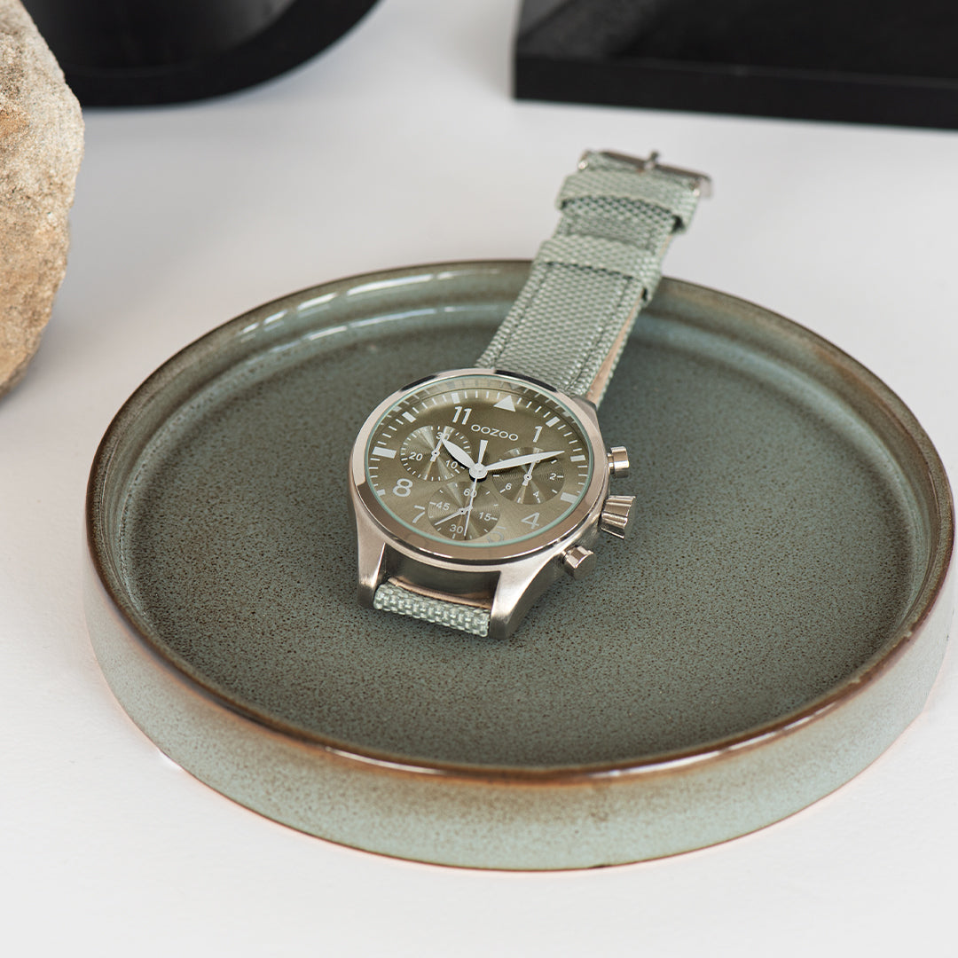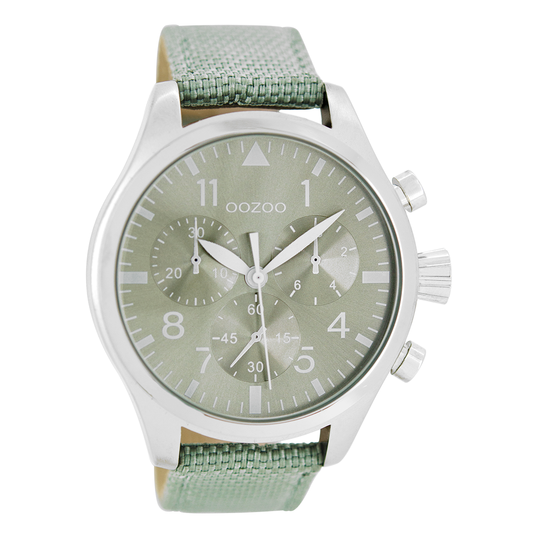 Stand out with this beautiful round gents design from the trendy OOZOO Timepieces collection. The C6795 has a stitched mint green NATO watch strap and 45 mm silver coloured metal watch case. You are making quite the fashion statement with this mint green chrono/sunray dial, silver coloured stripes and numbers digits and matching hands. This essential watch for your wardrobe has a mineral glass, stainless steel backplate and is nickel safe. This watch has a 2 Japanese movement and is covered by a 2 year warranty (see section 3 of our Refund, shipping & warranty policy).