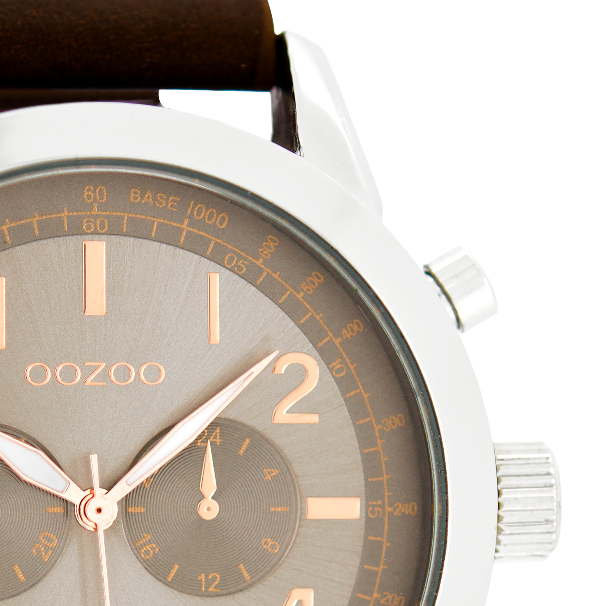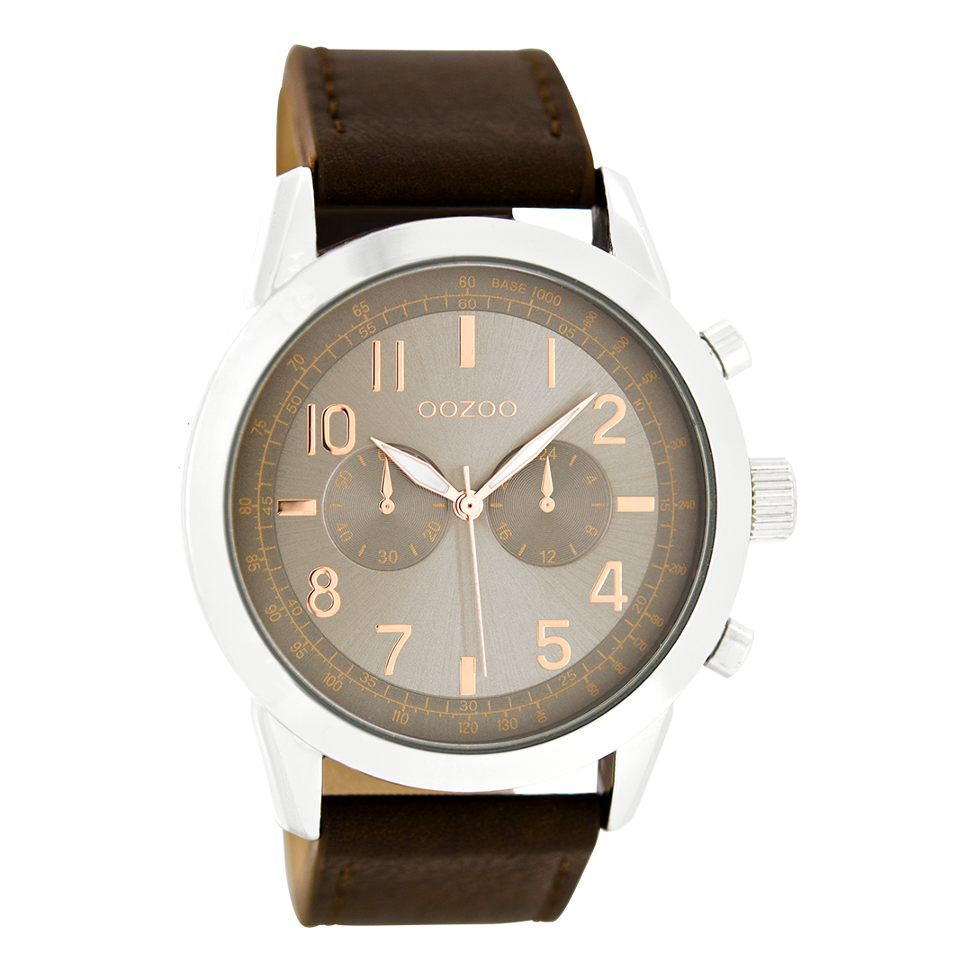 Silver coloured OOZOO watch with dark brown leather strap - C6885