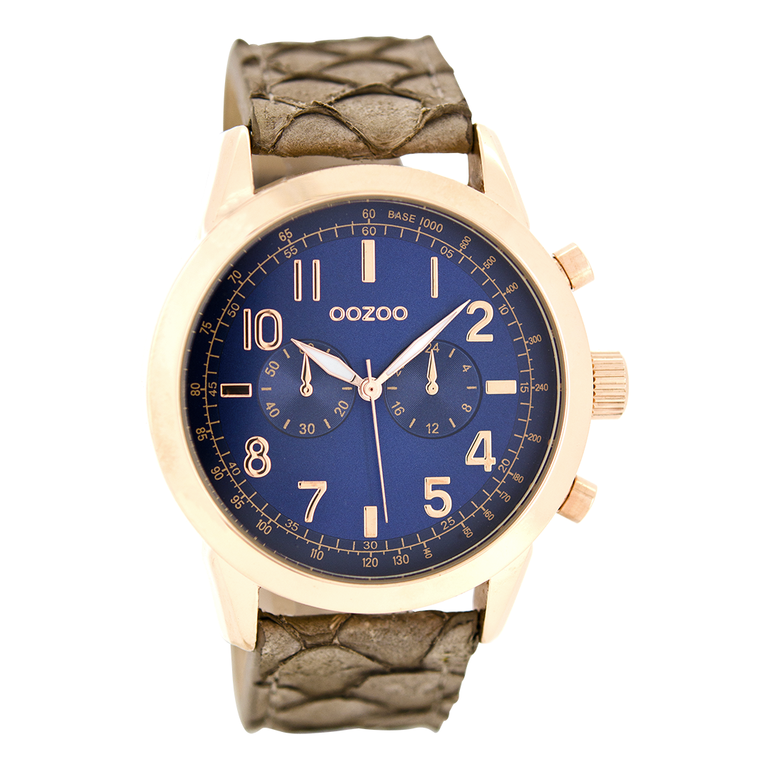 Stand out with this beautiful round ladies design from the trendy OOZOO Timepieces collection. The C6887 has a snake brown leather strap and 43 mm rose gold coloured metal watch case. You are making quite the fashion statement with this dark blue chrono dial, rose gold coloured stripes and numbers digits and rose gold coloured/white hands. This essential watch for your wardrobe has a mineral glass, stainless steel backplate and is nickel safe. This watch has a 2 Japanese movement and is covered by a 2 year warranty (see section 3 of our Refund, shipping & warranty policy).