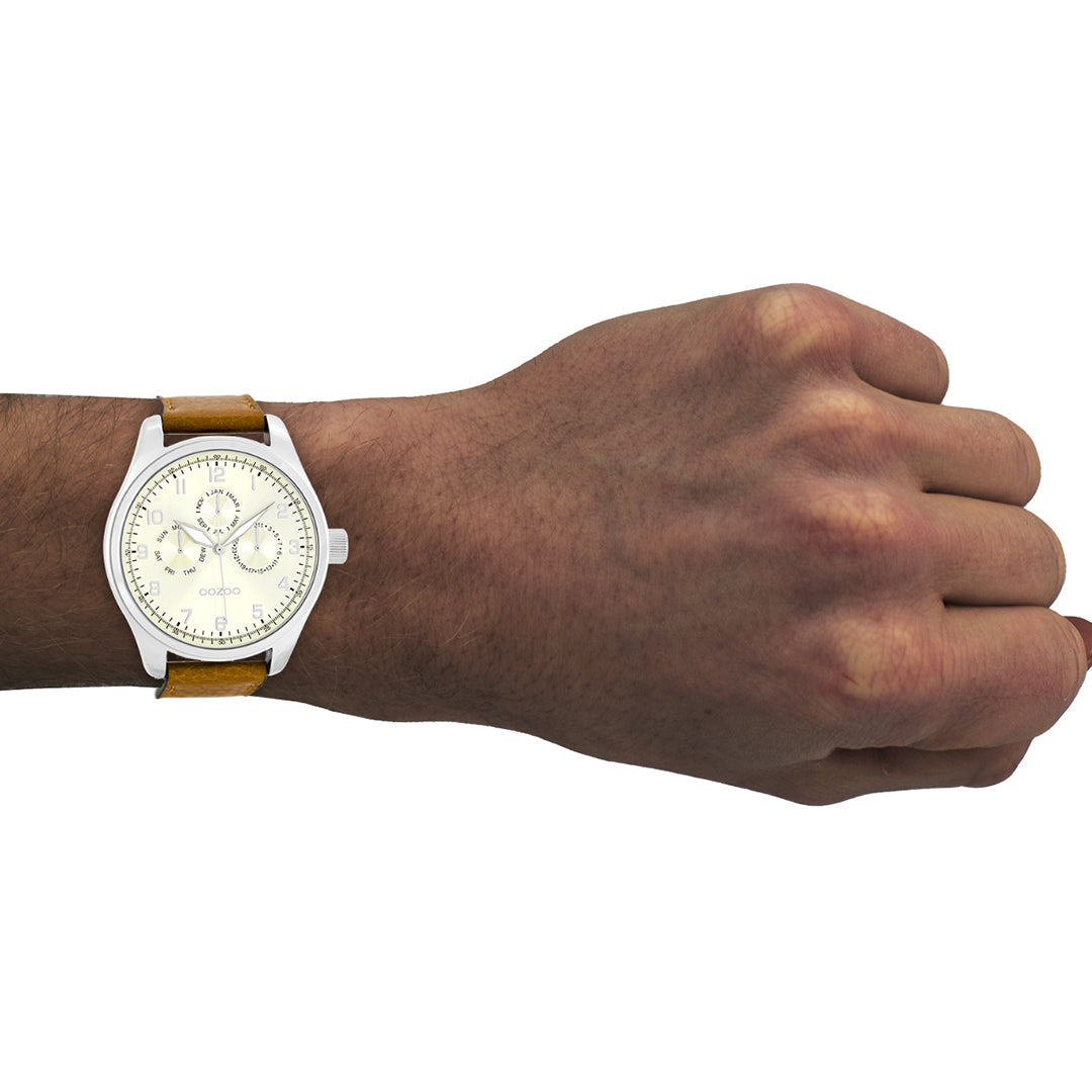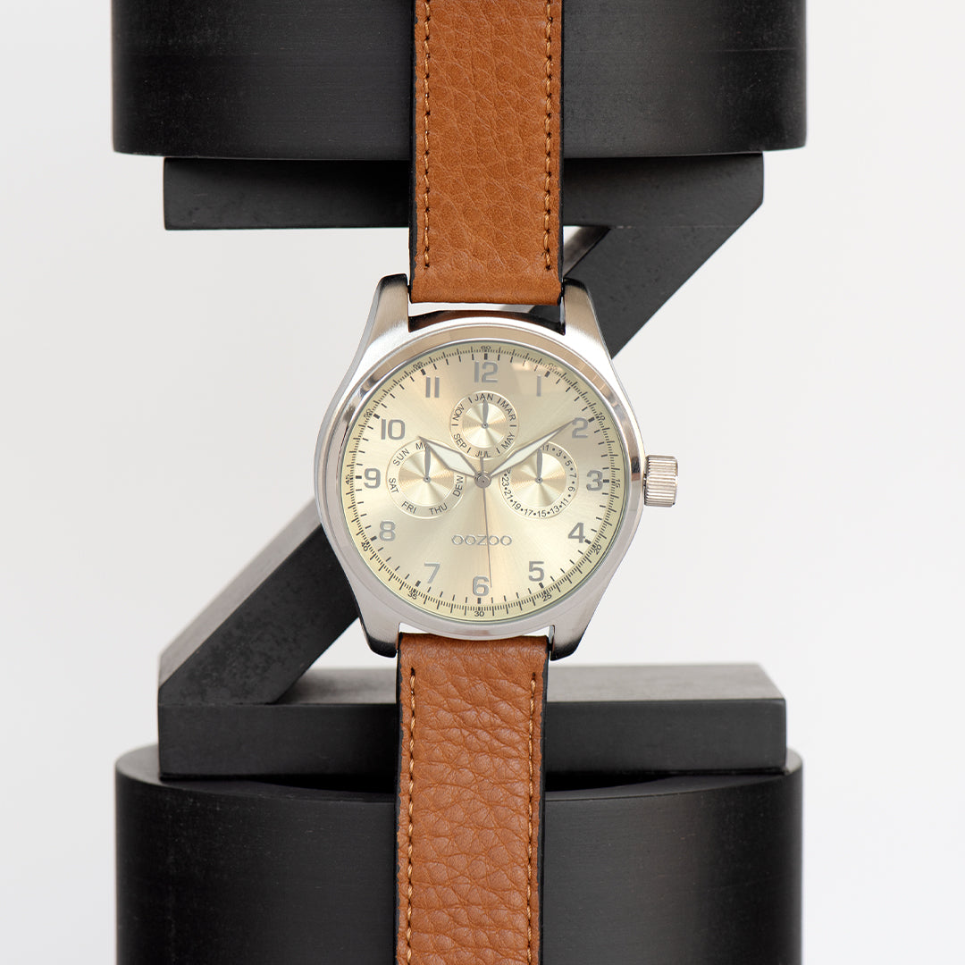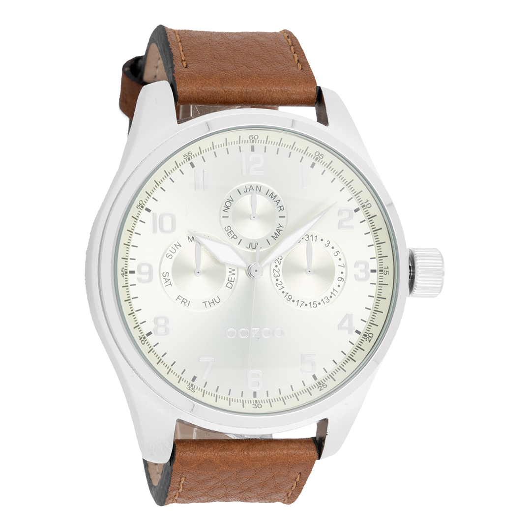 Silver coloured OOZOO watch with cognac leather strap - C8596