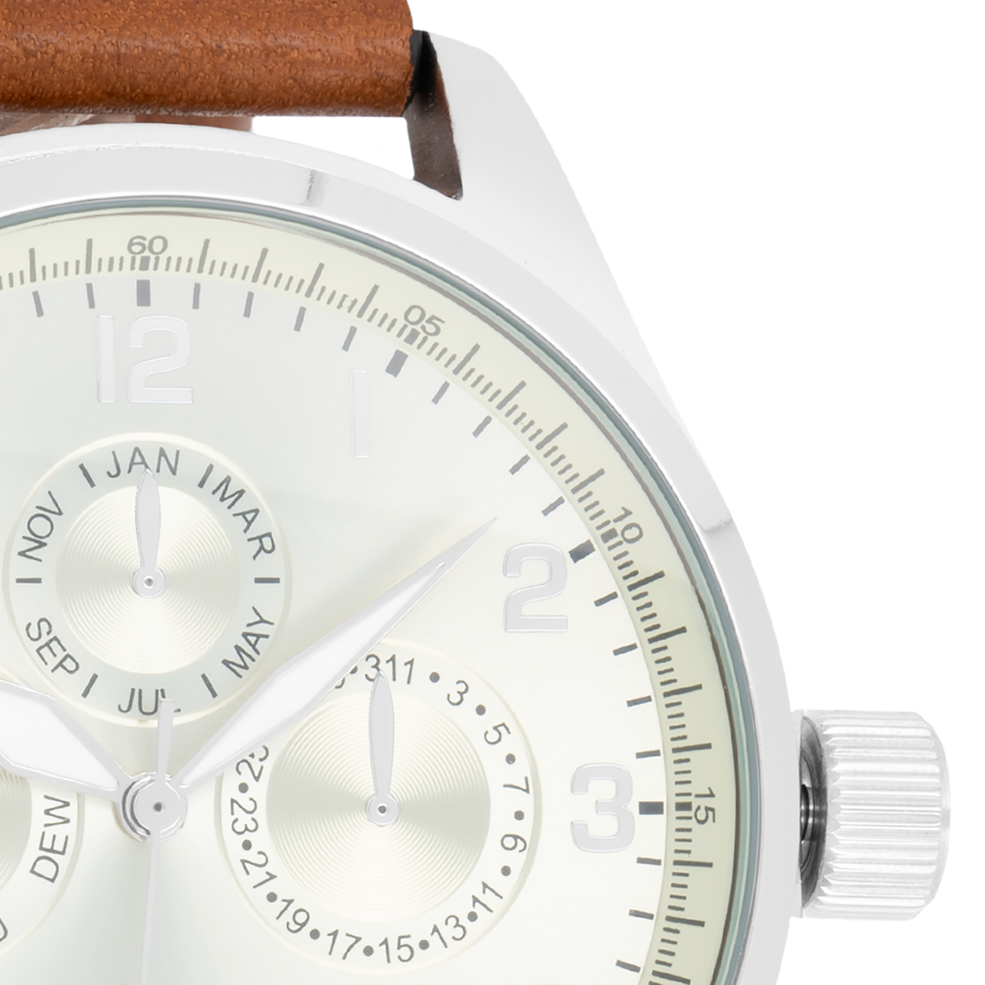 Stand out with this beautiful round gents design from the trendy OOZOO Timepieces collection. The C8596 has a stitched cognac leather strap and 48 mm silver coloured metal watch case. You are making quite the fashion statement with this champaign chrono/sunray dial, silver coloured stripes and numbers digits and silver coloured/white hands. This essential watch for your wardrobe has a mineral glass, stainless steel backplate and is nickel safe. This watch has a 2 Japanese movement and is covered by a 2 year warranty (see section 3 of our Refund, shipping & warranty policy).