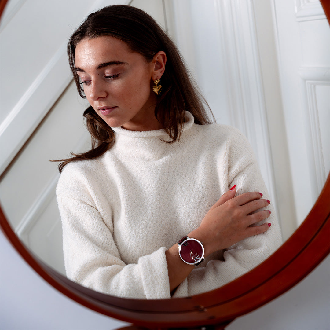 Silver coloured OOZOO watch with burgundy leather strap - C9241