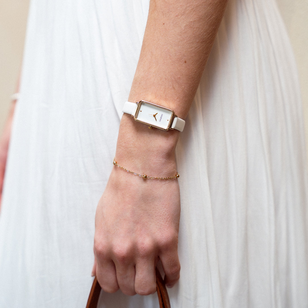 Val op met dit prachtige rechthoekig dames design uit de trendy OOZOO Timepieces collectie. De C11530 heeft een witte leren band en 19x31 mm goudkleurige metalen horlogekast. Maak een fashion statement met deze witte wijzerplaat, goudkleurige stippen tijdsaanduidingen en bijpassende wijzers. Dit horloge is een musthave voor jouw garderobe en heeft een mineraalglas, stainless steel achterplaat en is nikkel-safe. Dit horloge heeft een 2ATM Japans uurwerk en wordt gedekt door een garantie van 2 jaar (zie sectie 3 van onze Refund, shipping & warranty policy).