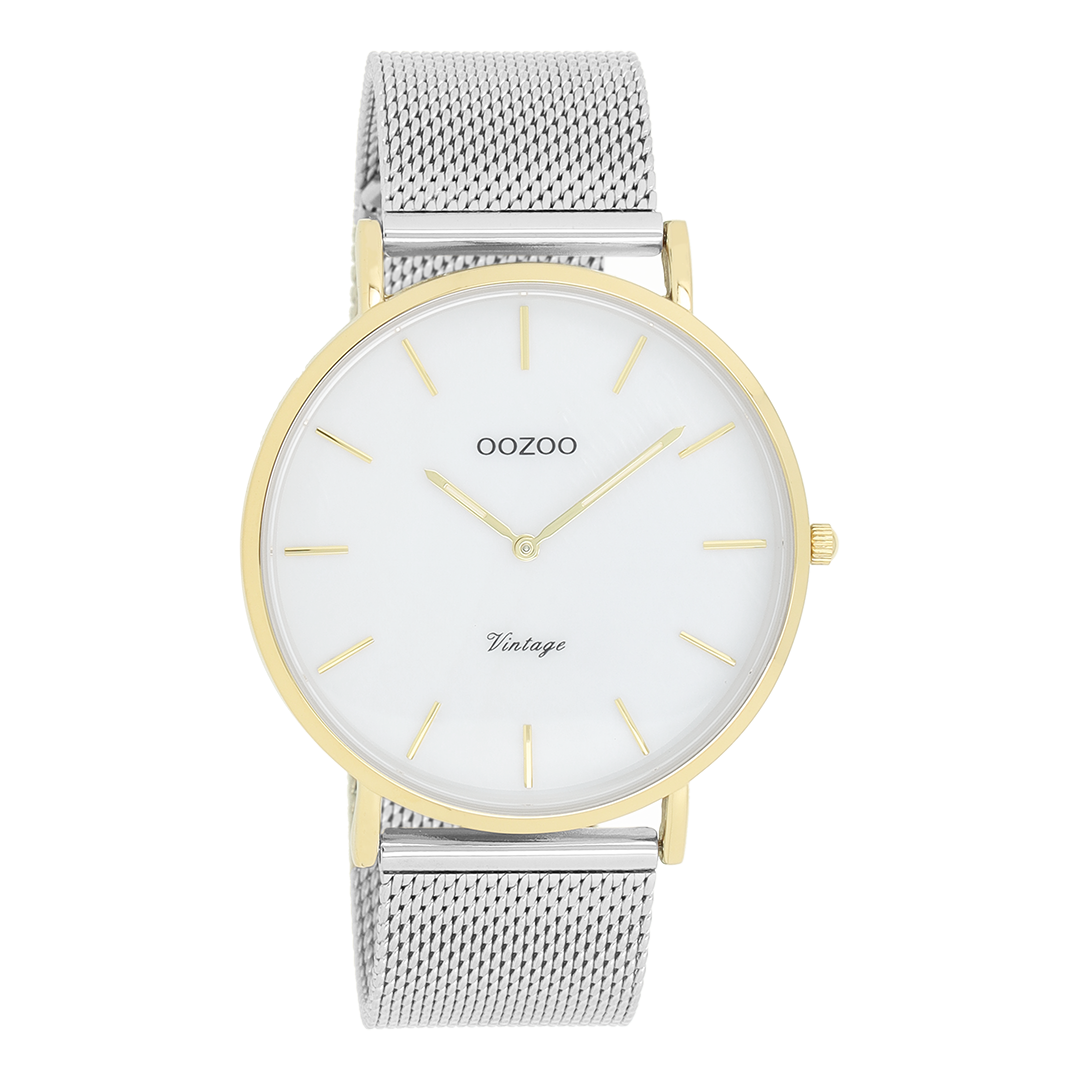 The classic look stays key in this trendy series and therefore, this round OOZOO vintage design with a playful wink is the season must-have! This unisex watch is the perfect combination of fashion and comfort with its 40 mm gold coloured metal watch case and white pearl dial. The silver coloured metal mesh bracelet makes this watch a trendy accessory, which you can wear every day. The dial has gold coloured stripes digits and matching hands. The C20119 adds the sparkle to your outfit. The mineral glass lays in a 6,9 mm slim metal watch case with IP-plating. This design has a stainless steel backplate and is nickel safe. This watch has a 2 Japanese movement and is covered by a 2 year warranty (see section 3 of our Refund, shipping & warranty policy).