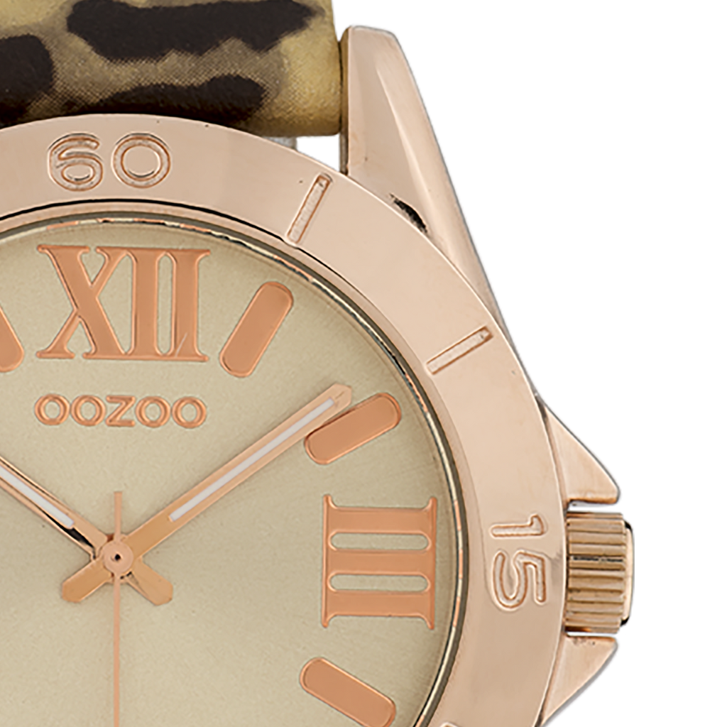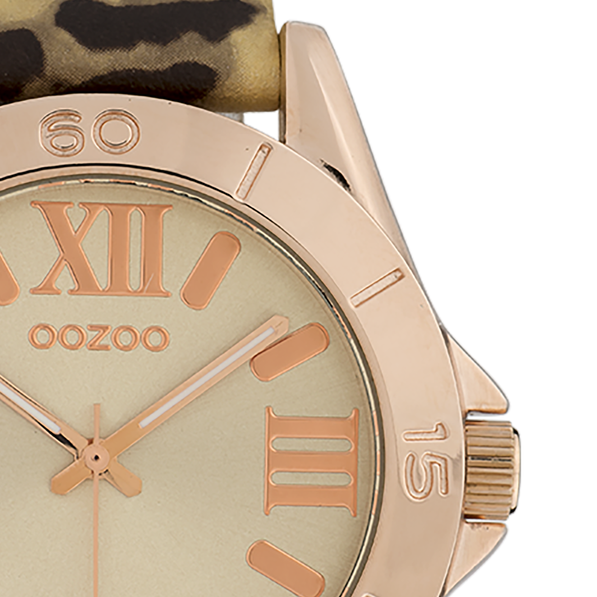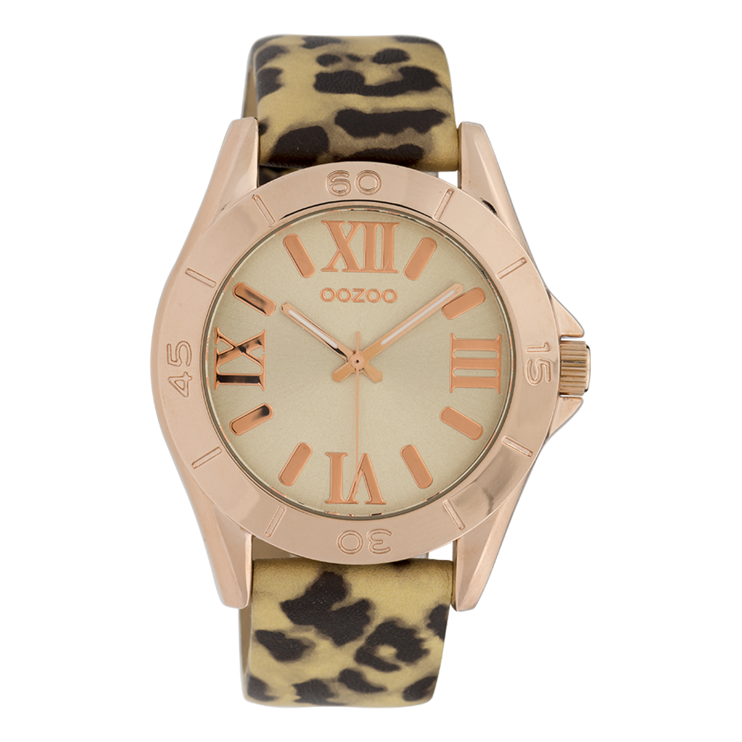 Val op met dit prachtige ronde dames design uit de trendy OOZOO Timepieces collectie. De C9783 heeft een luipaard print zwart/goudkleurige leren band en 40 mm rosé goudkleurige metalen horlogekast. Maak een fashion statement met deze rosé goudkleurige wijzerplaat, rosé goudkleurige strepen en romeinse cijfers tijdsaanduidingen en bijpassende wijzers. Dit horloge is een musthave voor jouw garderobe en heeft een mineraalglas, stainless steel achterplaat en is nikkel-safe. Dit horloge heeft een 2 Japans uurwerk en wordt gedekt door een garantie van 2 jaar (zie sectie 3 van onze Refund, shipping & warranty policy).