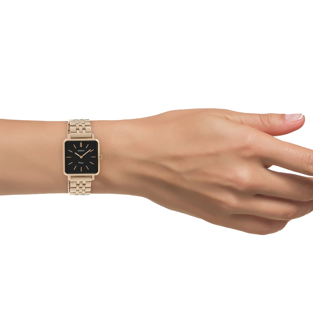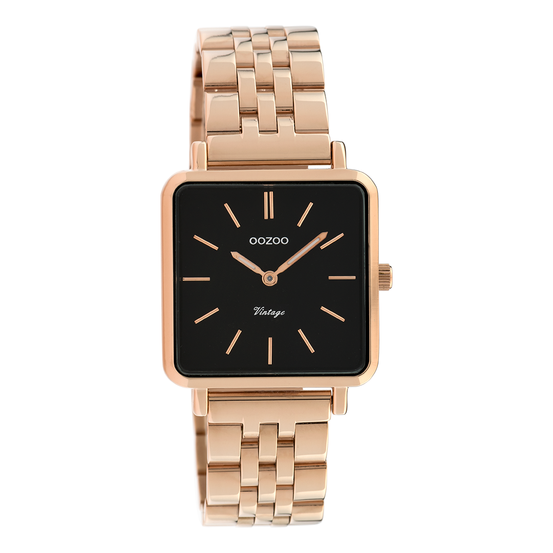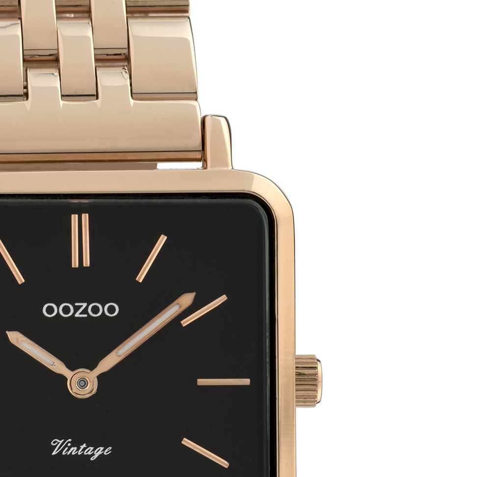 The classic look stays key in this trendy series and therefore, this square OOZOO vintage design with a playful wink is the season must-have! This ladies watch is the perfect combination of fashion and comfort with its 29 mm rose gold coloured metal watch case and black dial. The rose gold coloured stainless steel bracelet makes this watch a trendy accessory, which you can wear every day. The dial has rose gold coloured stripes digits and matching hands. The C9959 adds the sparkle to your outfit. The mineral glass lays in a 6,9 mm slim metal watch case with IP-plating. This design has a stainless steel backplate and is nickel safe. This watch has a 2 Japanese movement and is covered by a 2 year warranty (see section 3 of our Refund, shipping & warranty policy).